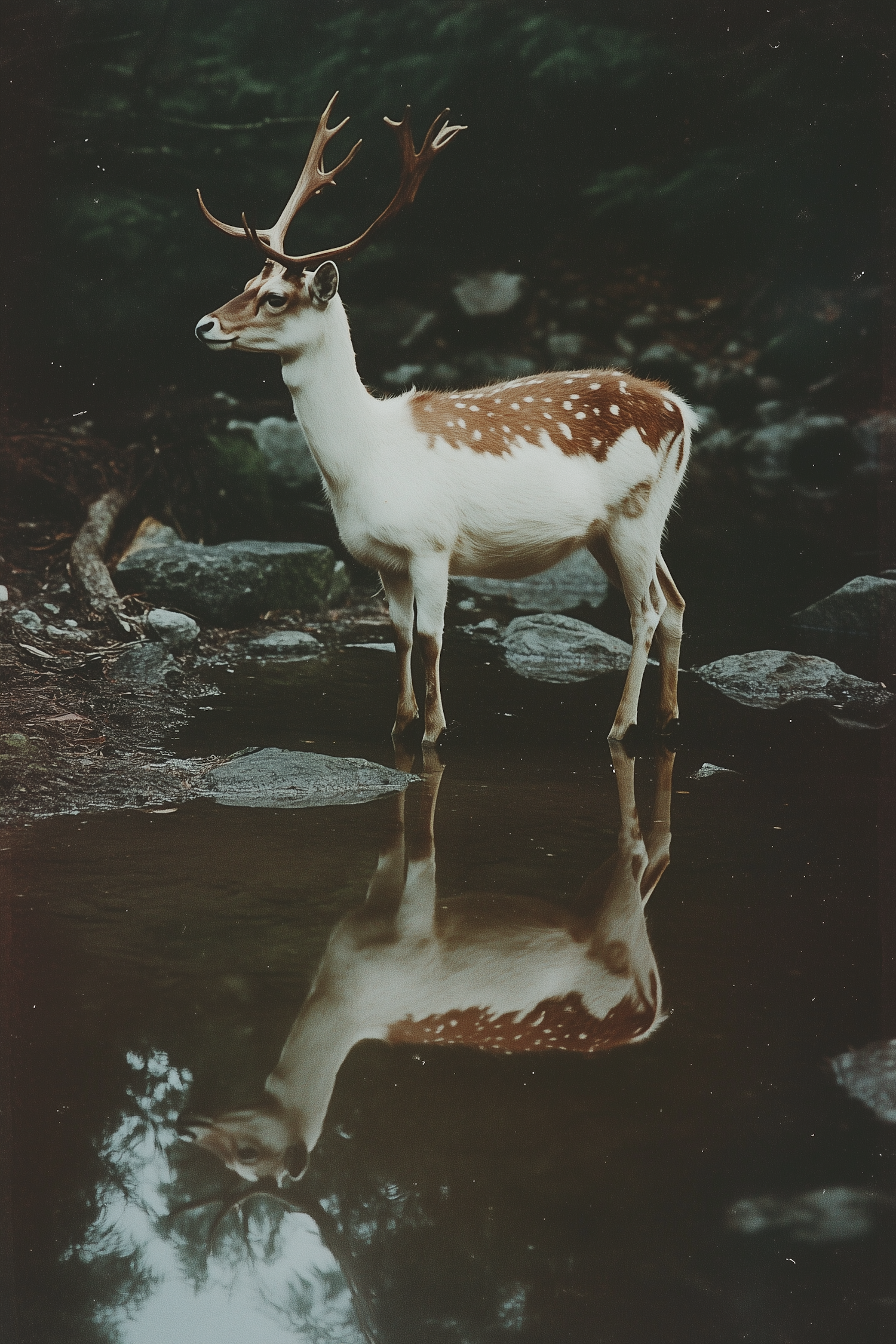Majestic deer with antlers reflected in a tranquil pool, surrounded by lush greenery and rocks, creating a serene natural scene.