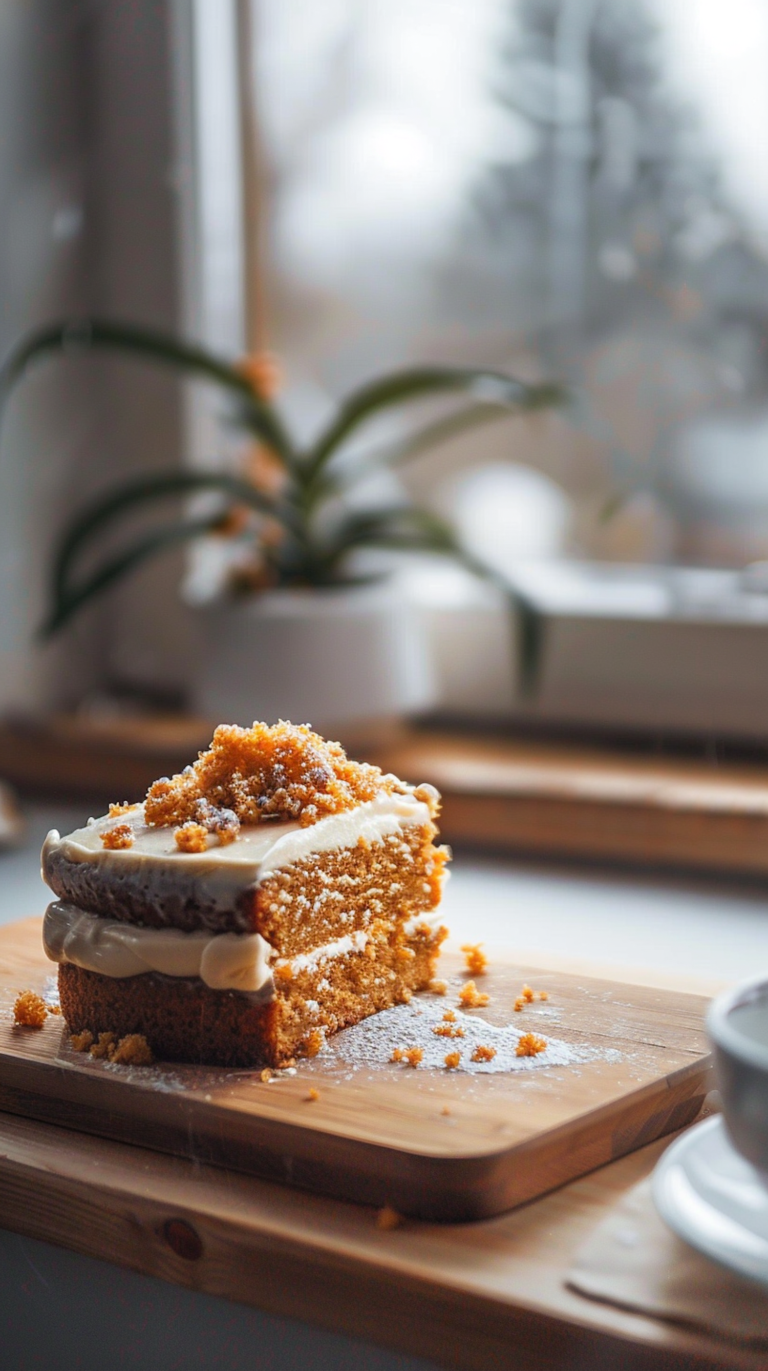 Delicious slice of carrot cake with creamy frosting on a wooden board, set in a cozy, sunlit kitchen scene.