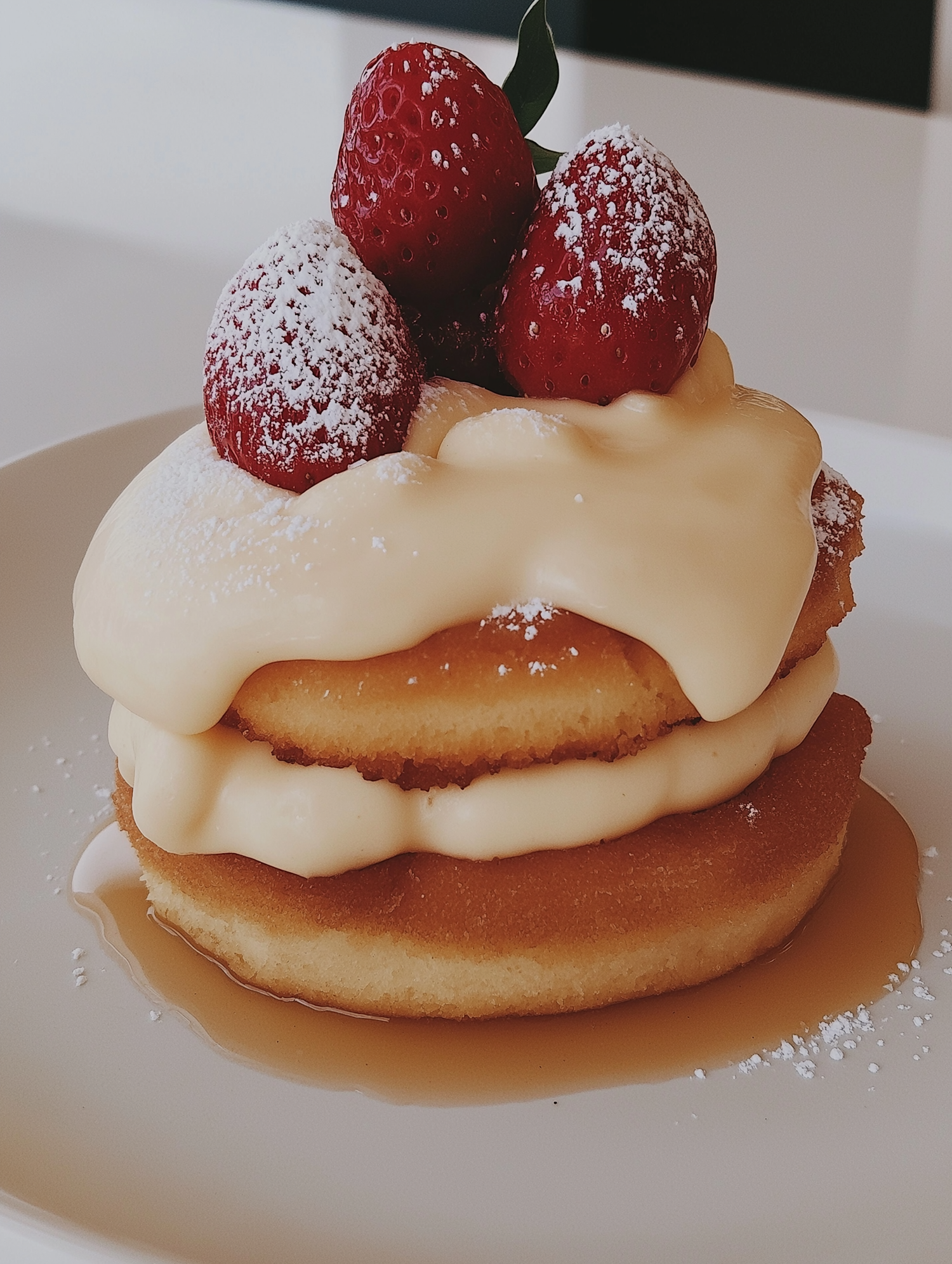 Delicious stack of pancakes with creamy custard, fresh strawberries, and syrup on a white plate. Perfect for a sweet breakfast treat.