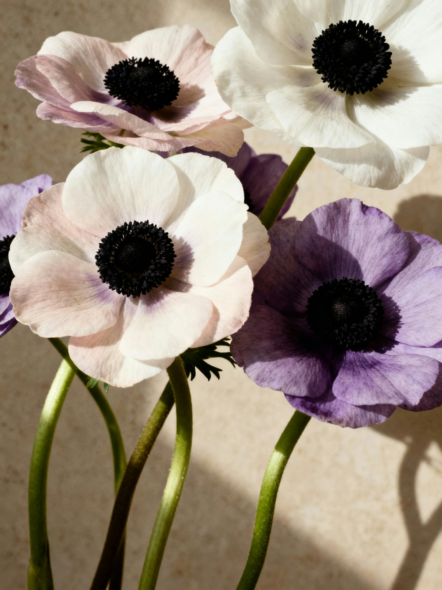 Close-up of pastel anemone flowers with dark centers, showcasing their delicate petals and vibrant contrast in soft lighting.