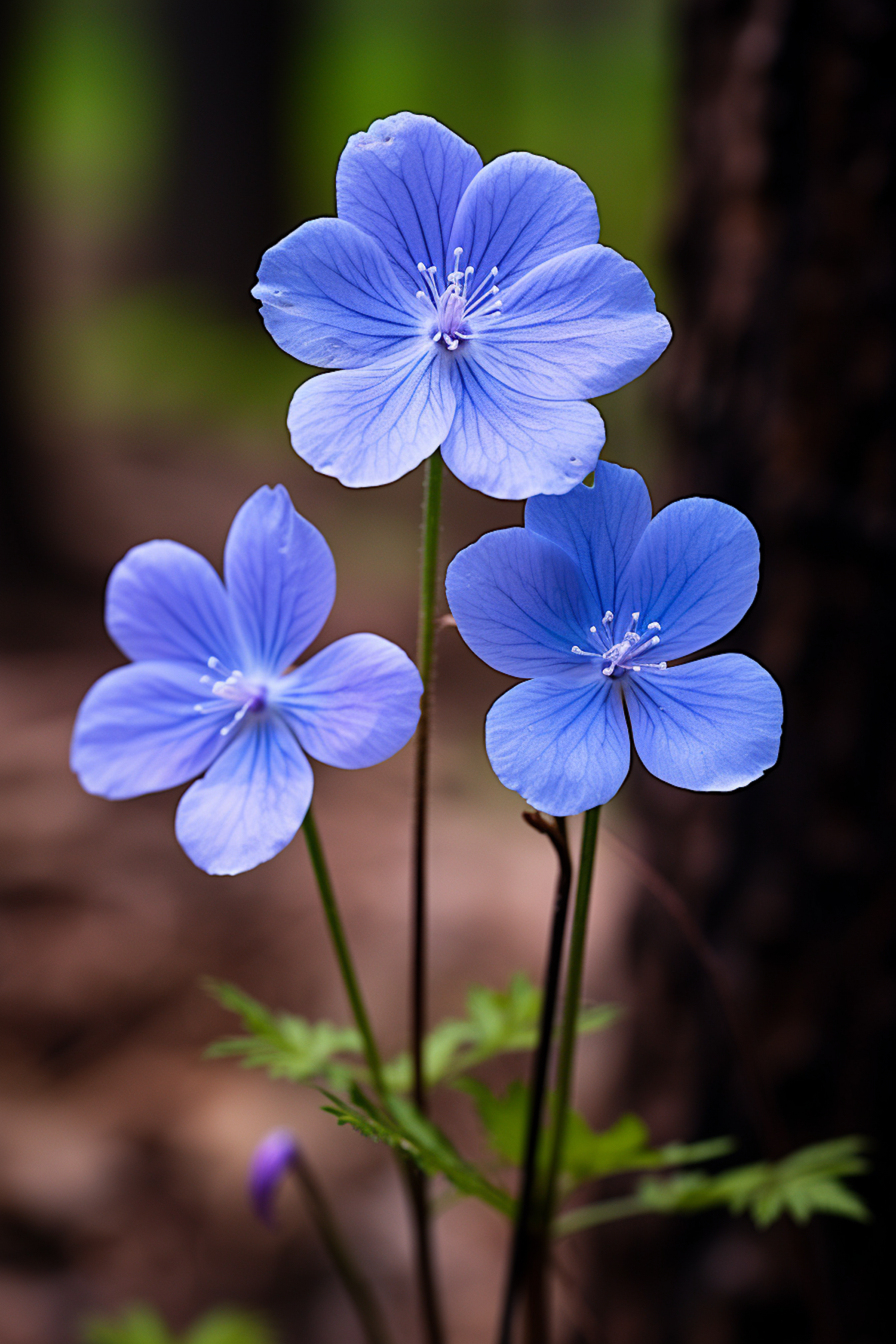 Three delicate blue flowers with soft petals and white stamens, set against a blurred natural background, exuding serene beauty.