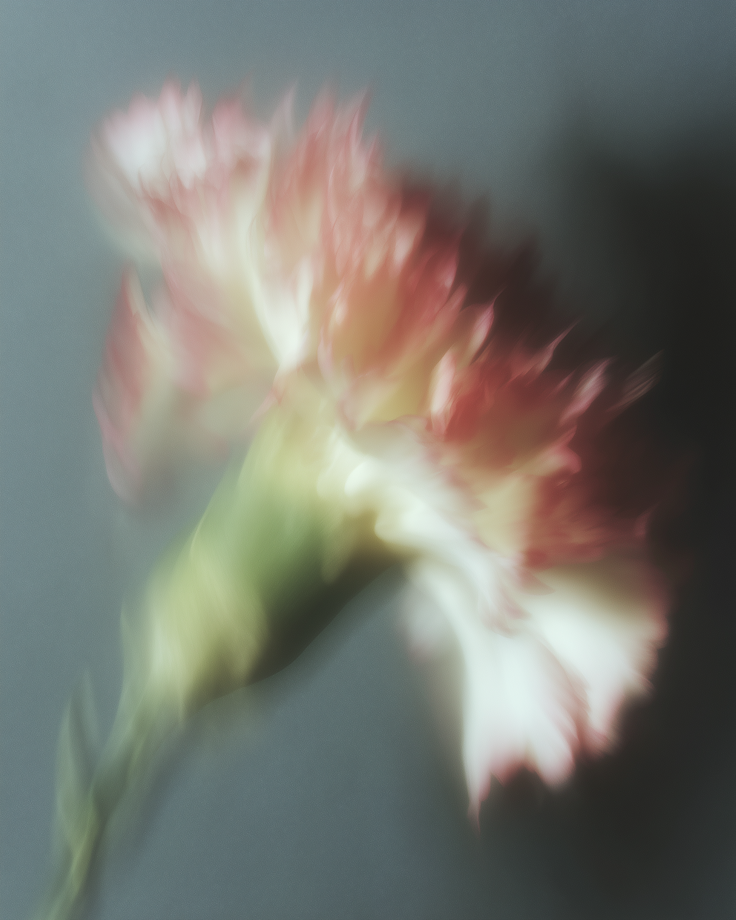 A dreamy, soft-focus image of a pink and white carnation flower against a muted gray background, creating an ethereal and artistic feel.
