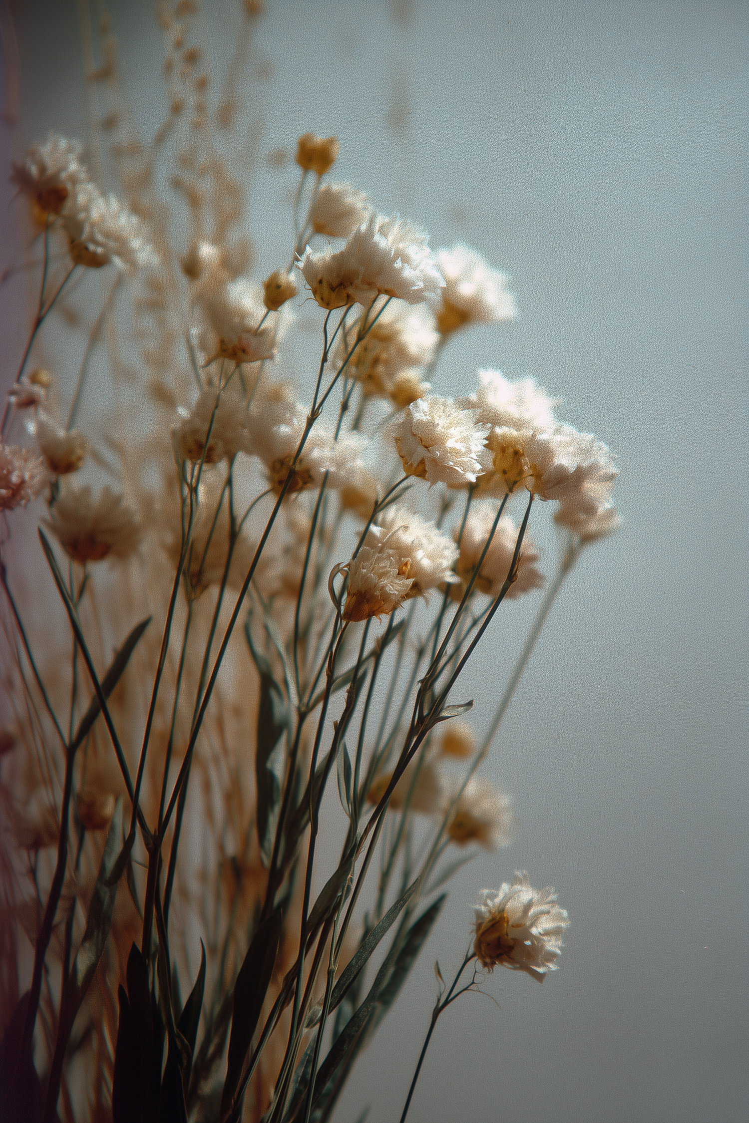 A dreamy close-up of dried white flowers with feathery petals, set against a soft blue background. Perfect for serene, minimalistic vibes.