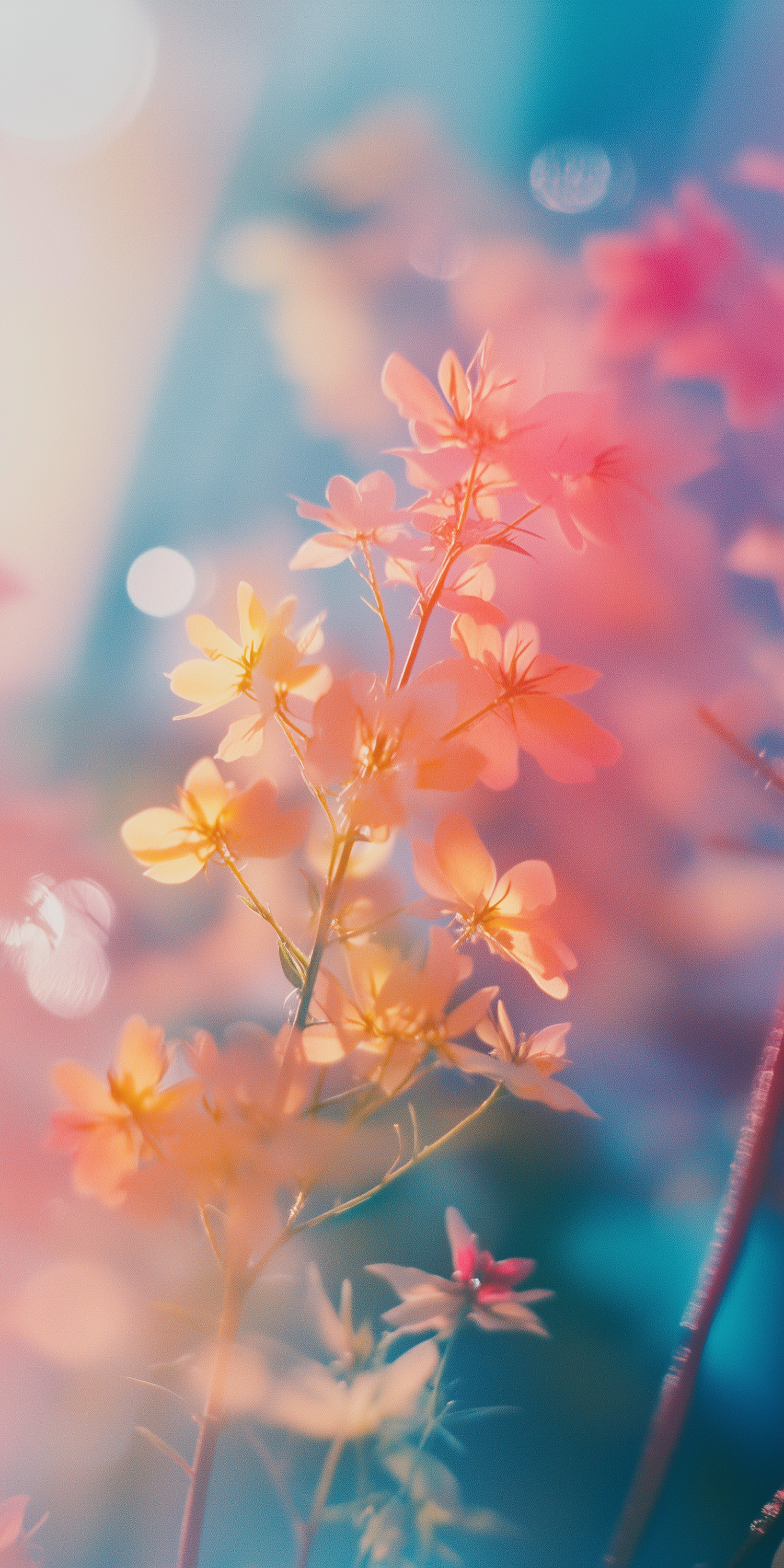 Dreamy flowers in soft focus with pink, orange, and yellow hues, set against a pastel blue and pink background with bokeh effects.