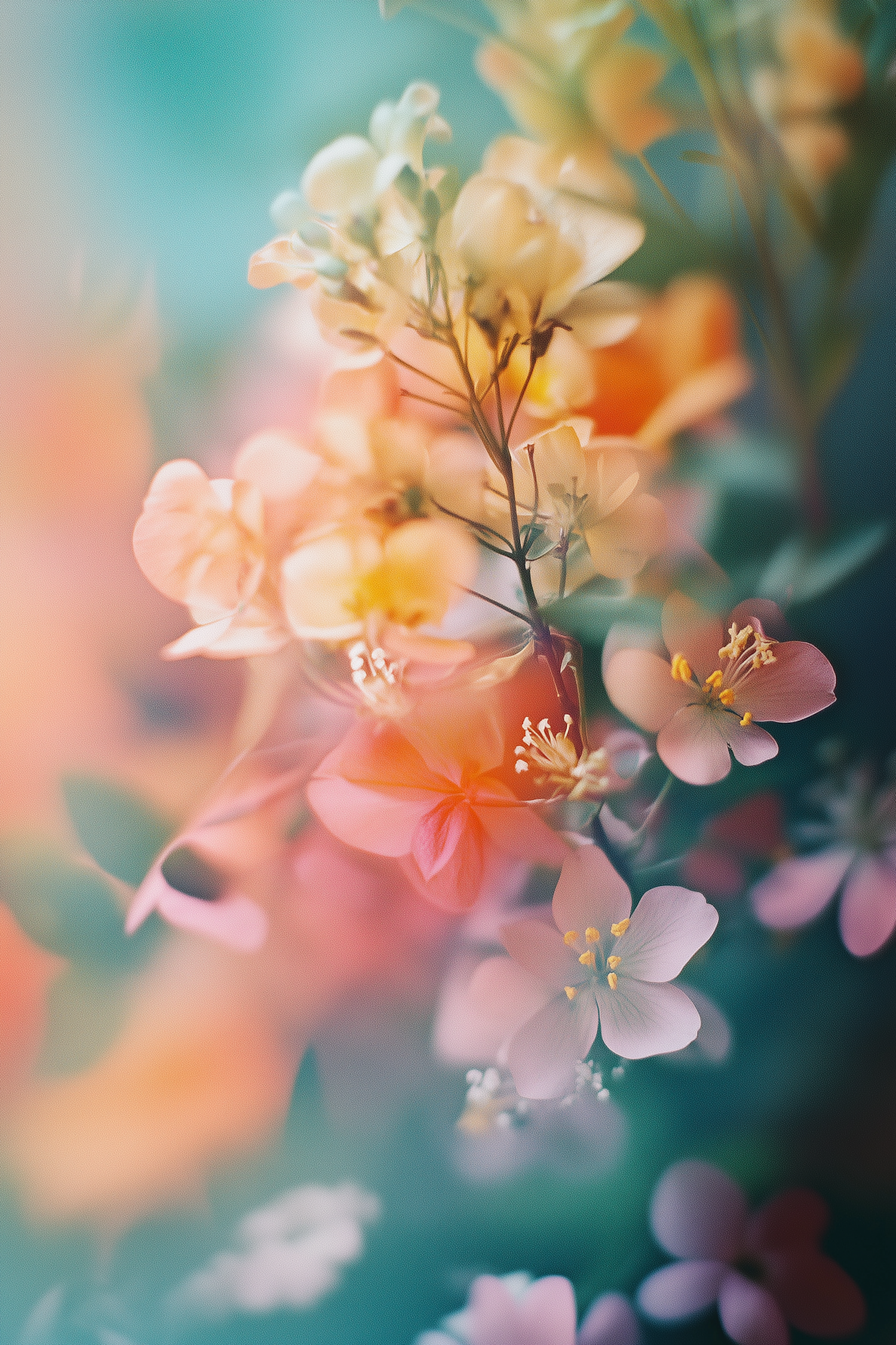 Ethereal close-up of pastel flowers with soft focus, creating a dreamy and serene atmosphere with delicate pink, peach, and yellow hues.