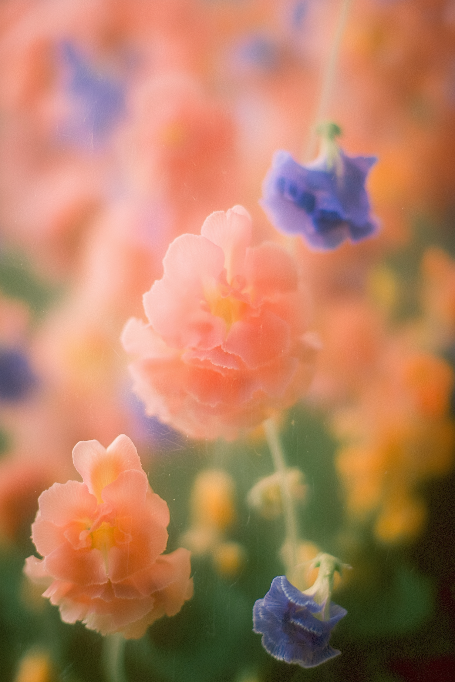 Dreamy pastel flowers with peach and blue hues create a tranquil, ethereal scene with soft lighting and blurred background.