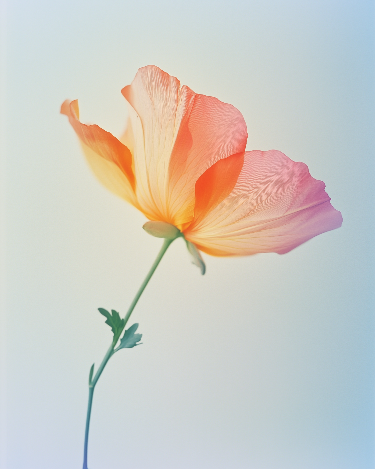 Elegant flower with translucent orange and pink petals on a slender green stem against a soft, blurred background.