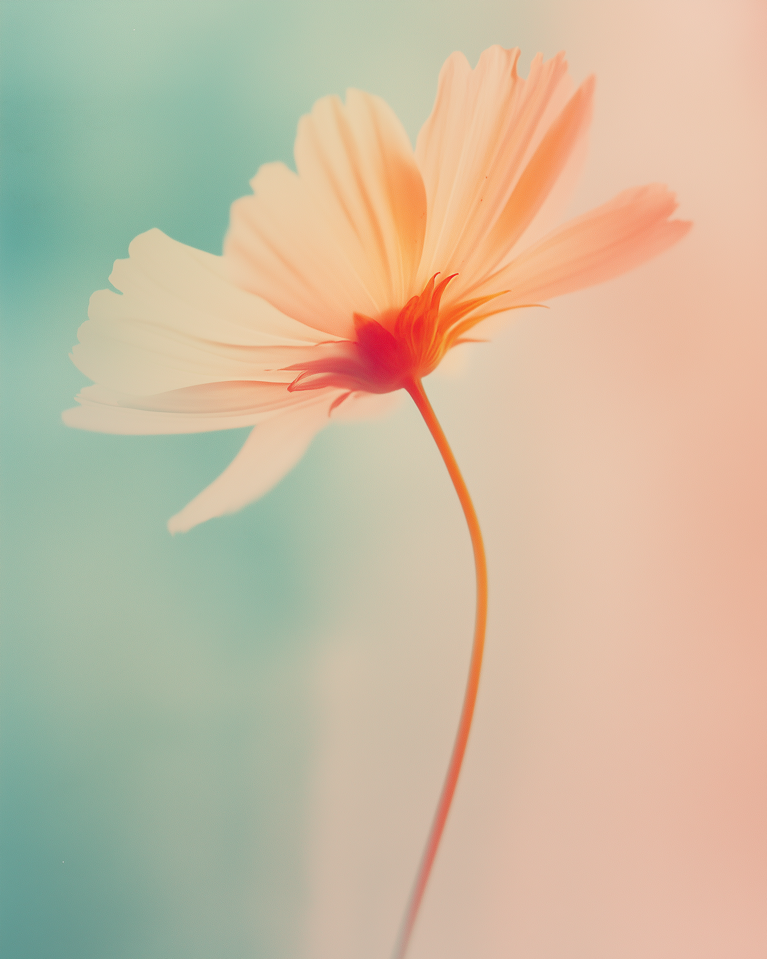 Close-up of a delicate flower with cream and peach petals against a teal and pink gradient background.