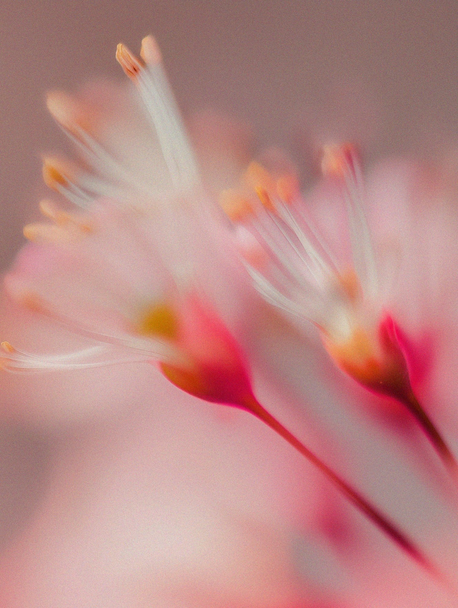 Dreamy macro shot of pink flower stamens with soft focus and blurred background, showcasing delicate white filaments and orange anthers.