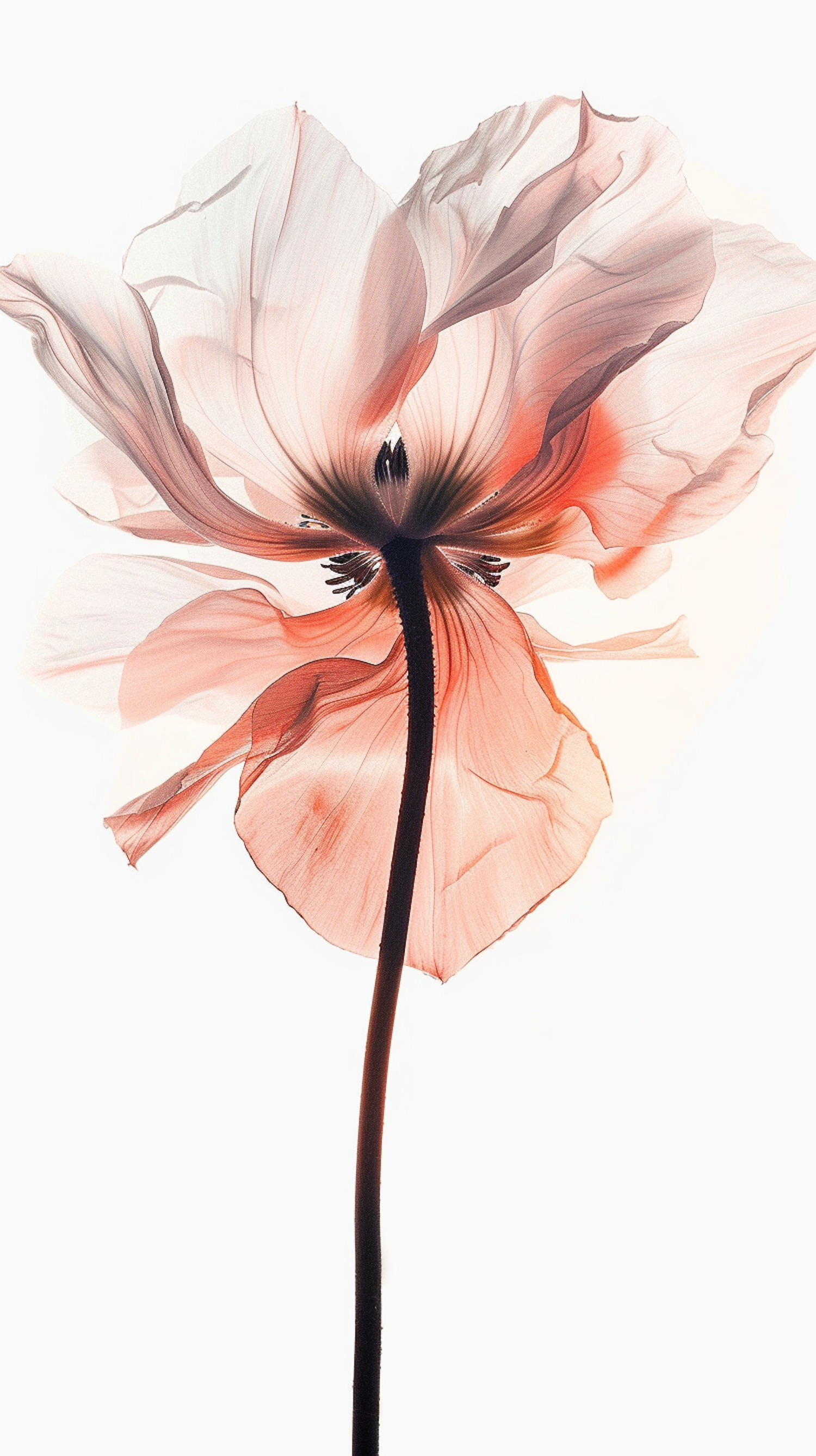 Elegant flower with translucent pink petals and a dark center on a white background, showcasing delicate beauty and minimalism.