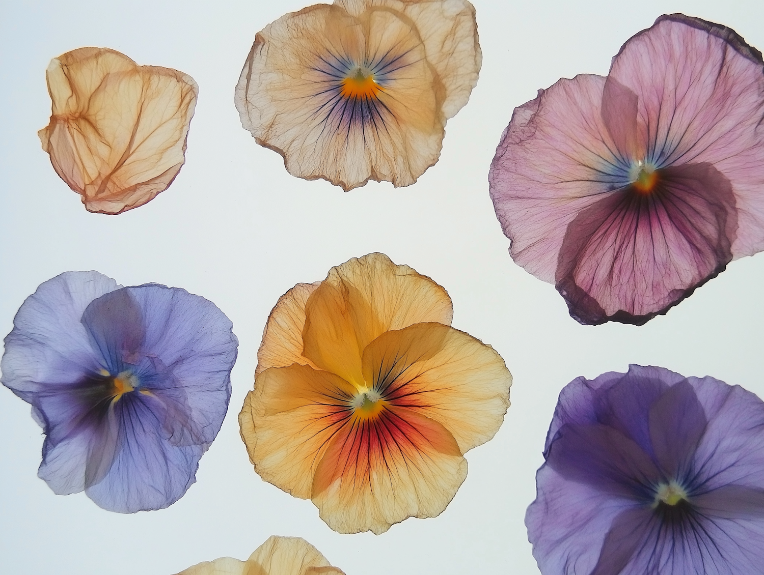 Delicate translucent flower petals in soft purples, pinks, and yellows against a white background, showcasing intricate veining.