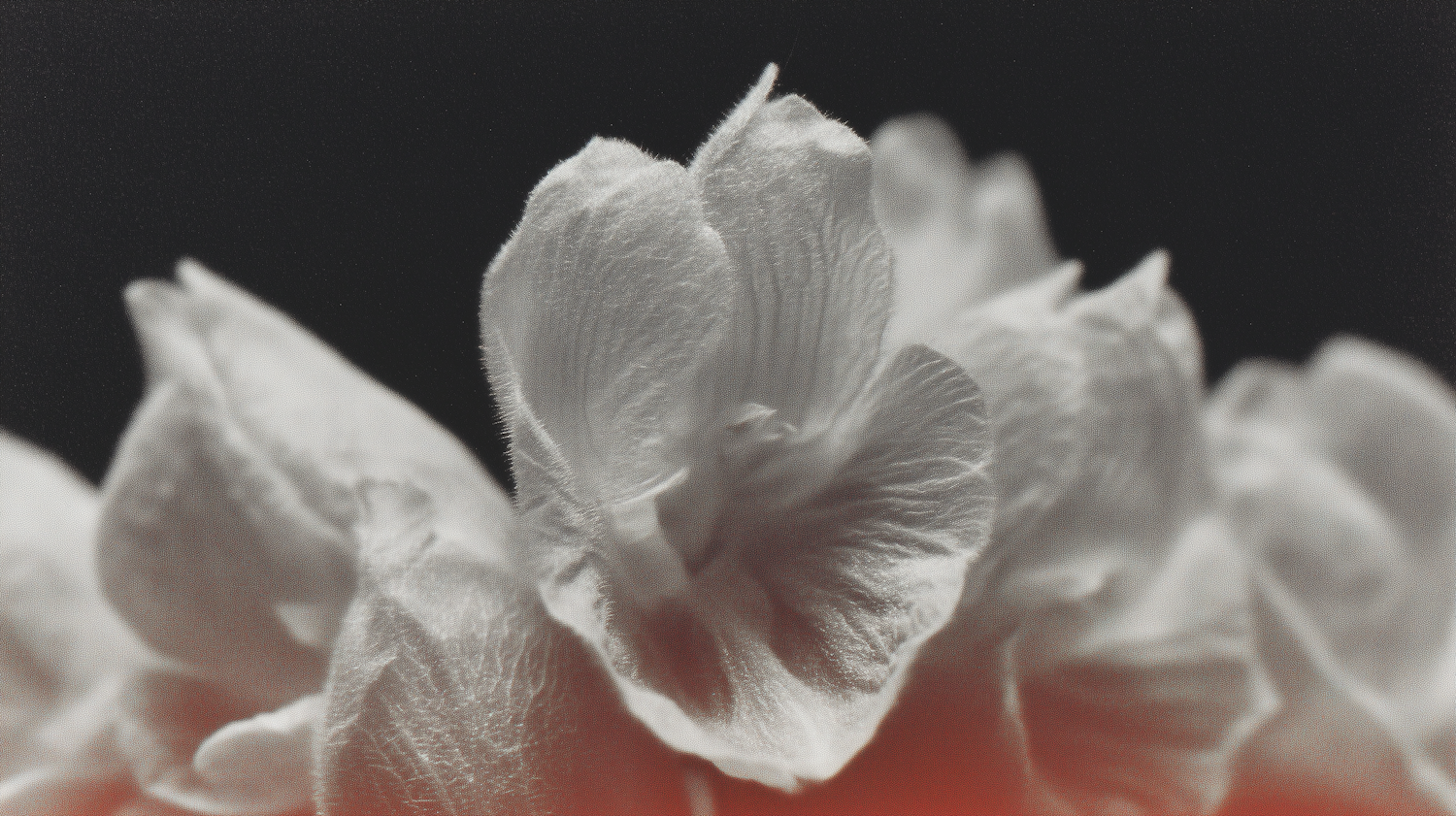 Black-and-white close-up of flower petals with intricate textures, soft folds, and a faint reddish hue at the bottom for artistic effect.