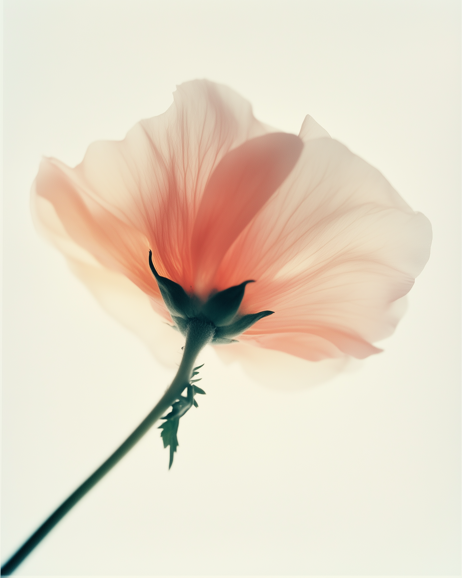 A delicate flower with translucent peach petals against a soft cream background, captured from a low angle for an ethereal effect.