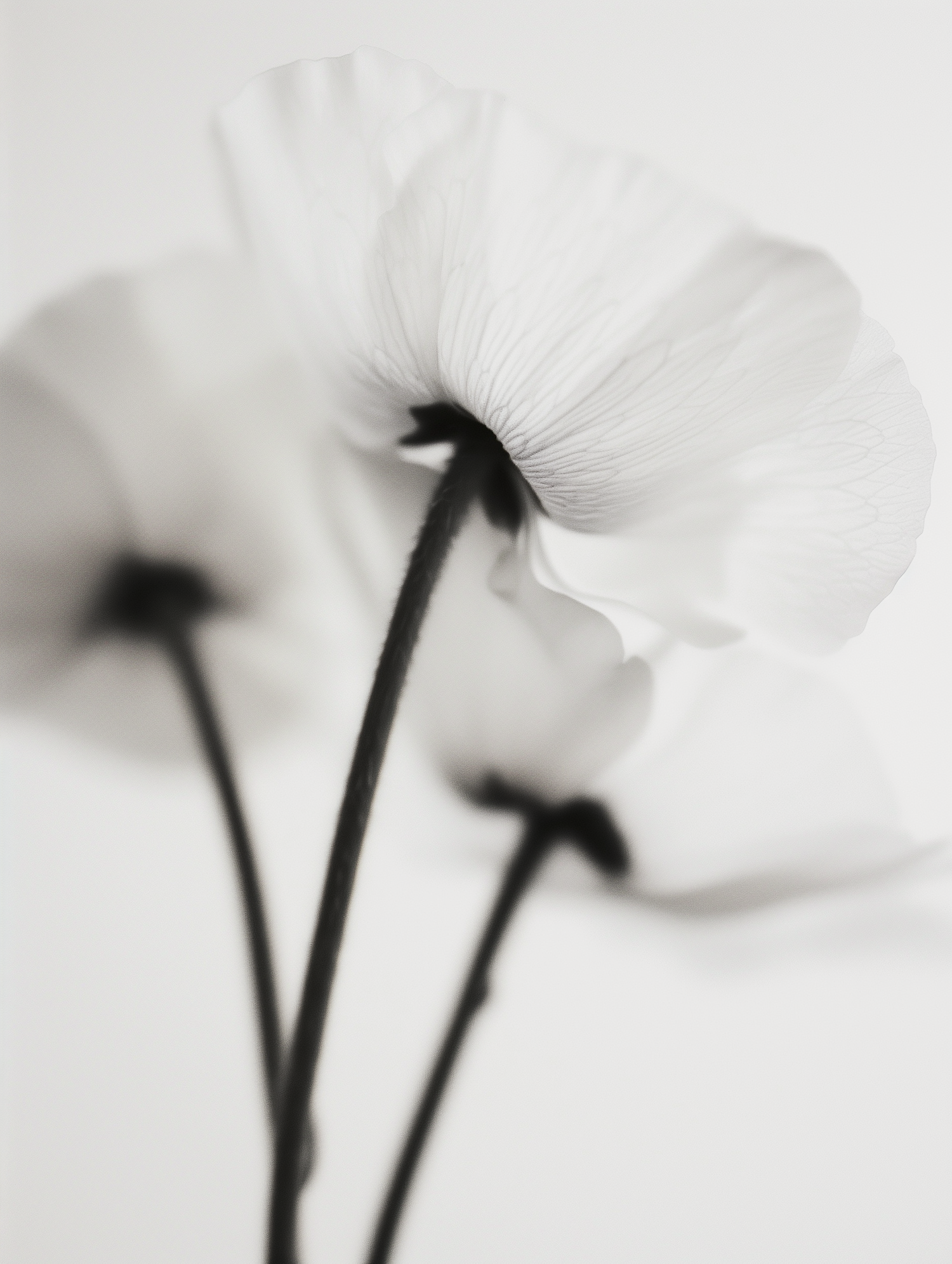 Elegant white flowers with translucent petals and dark stems in soft focus, creating a minimalistic and ethereal composition.