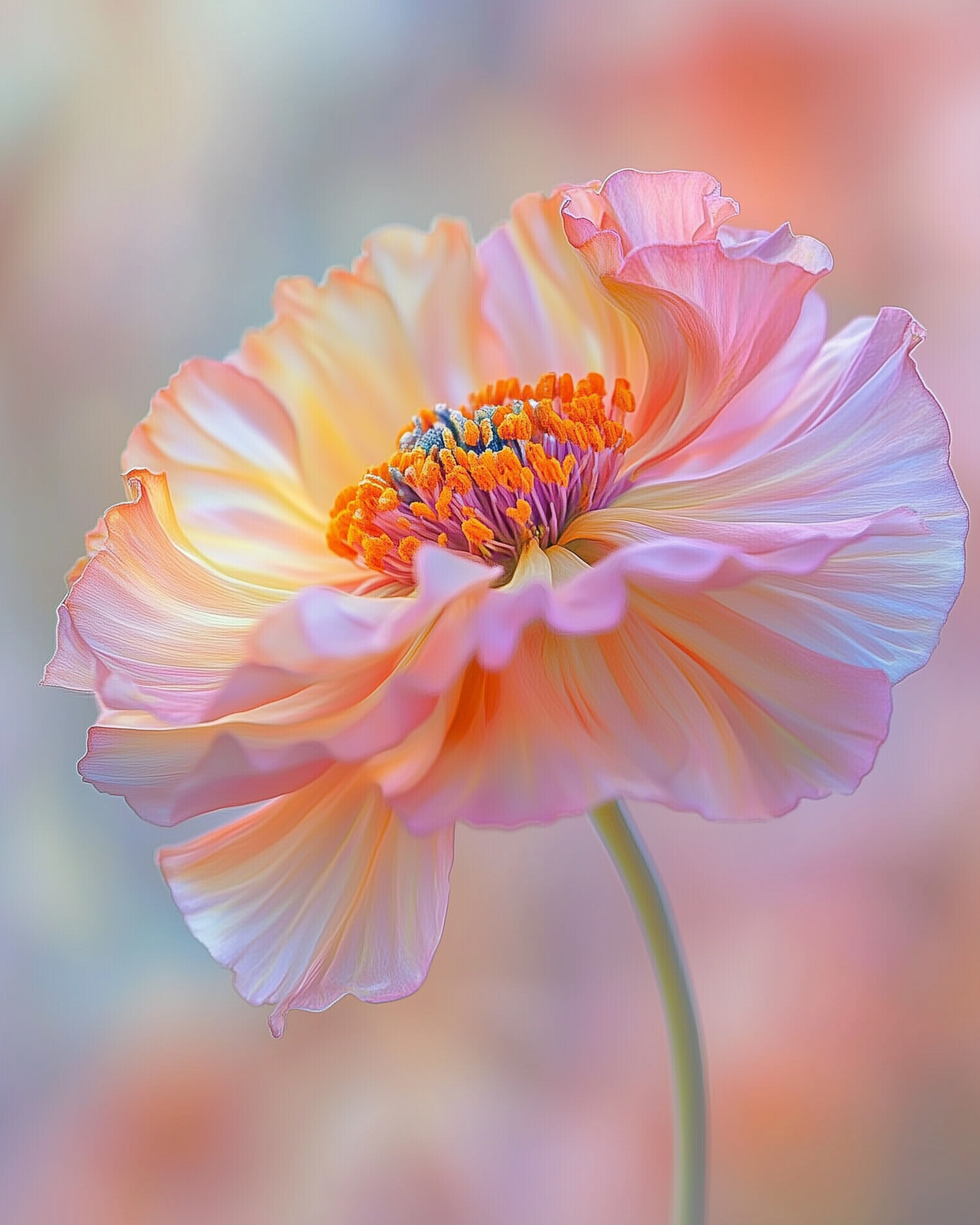 A stunning close-up of a pastel-colored flower with ruffled petals and vibrant stamens, set against a dreamy blurred background.