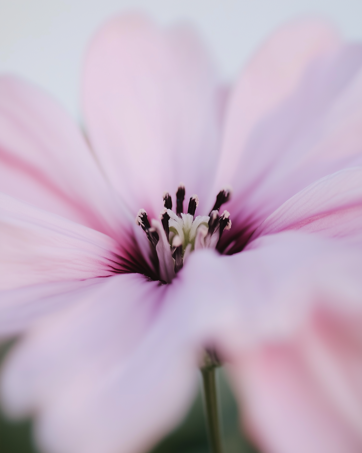 Macro shot of a pink flower with soft petals and detailed stamens, showcasing its delicate beauty against a blurred background.