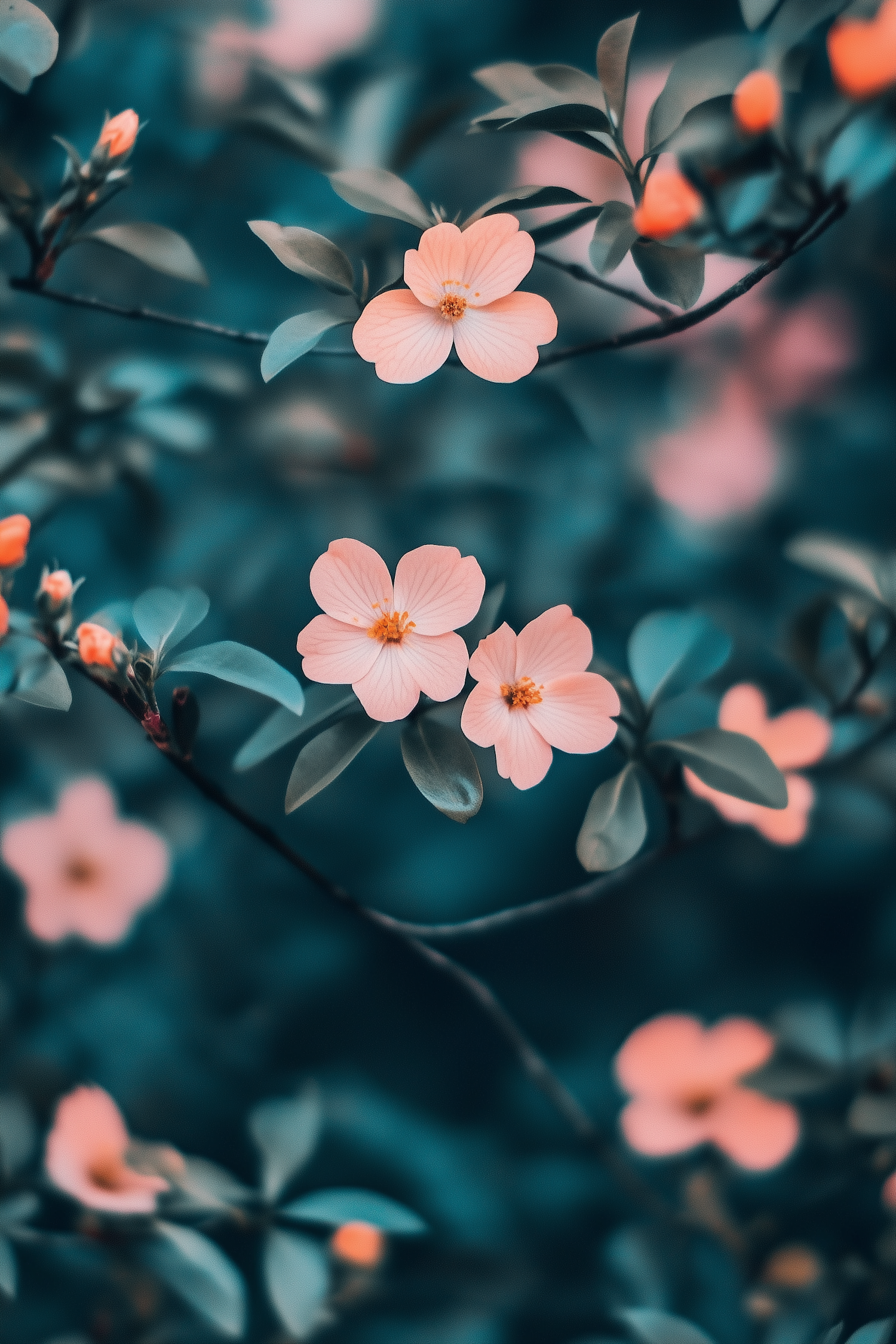 Delicate pink flowers with yellow centers against a teal background, creating a serene and harmonious floral scene.