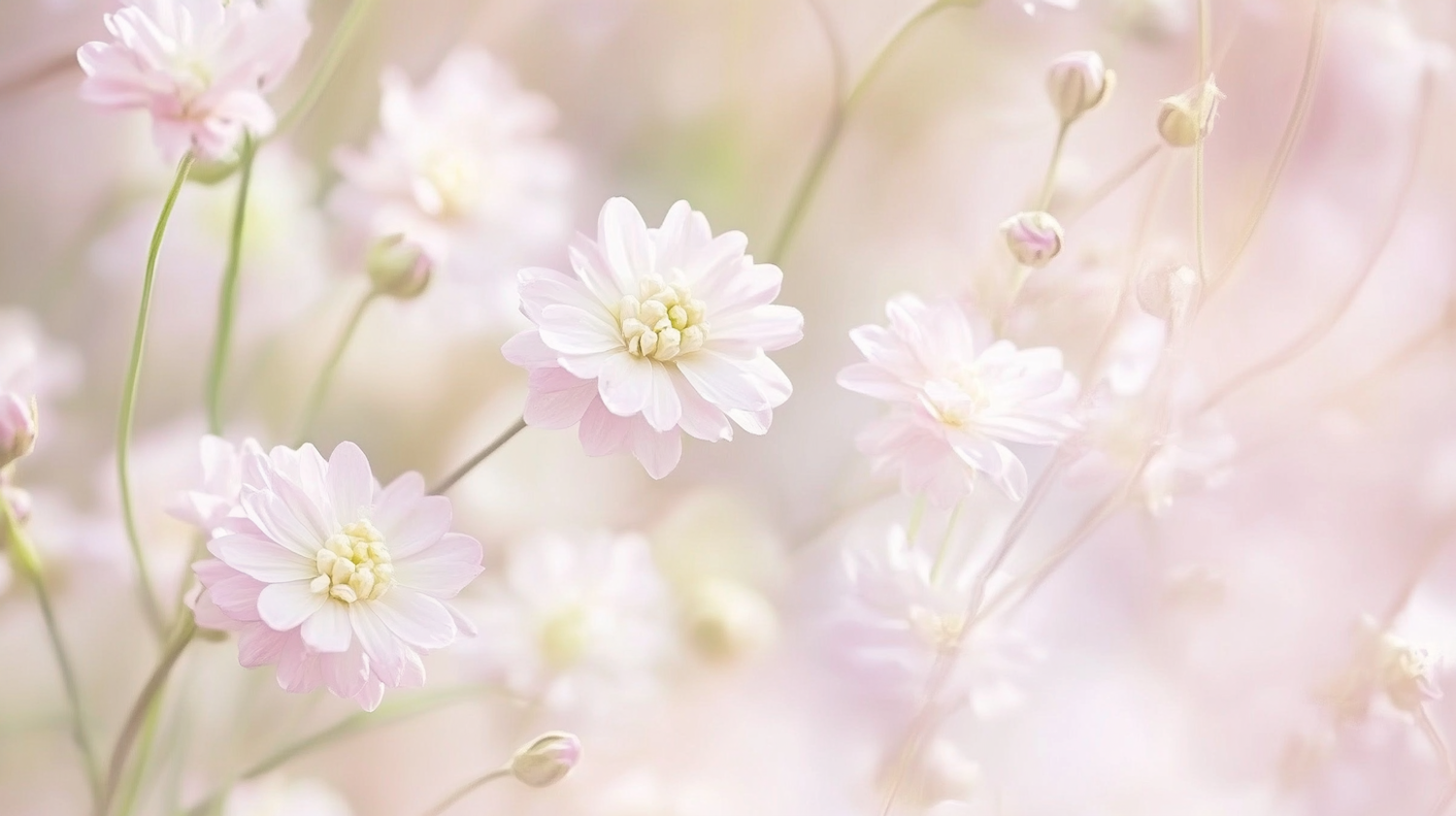 Soft-focus image of delicate white and pink flowers with green stems, creating a dreamy and serene atmosphere.