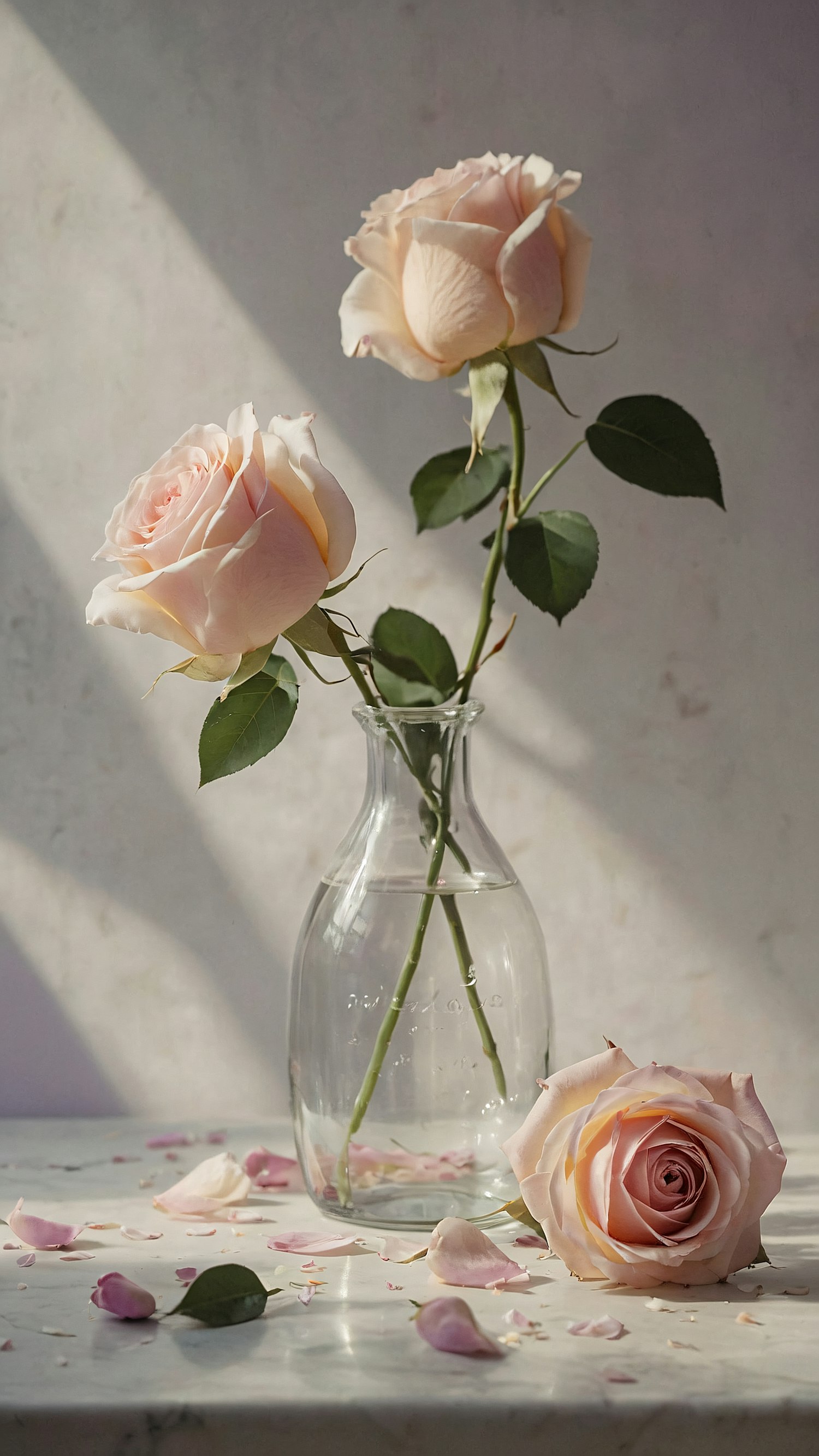 Elegant pale pink roses in a glass vase with scattered petals on a marble surface, creating a serene and romantic ambiance.