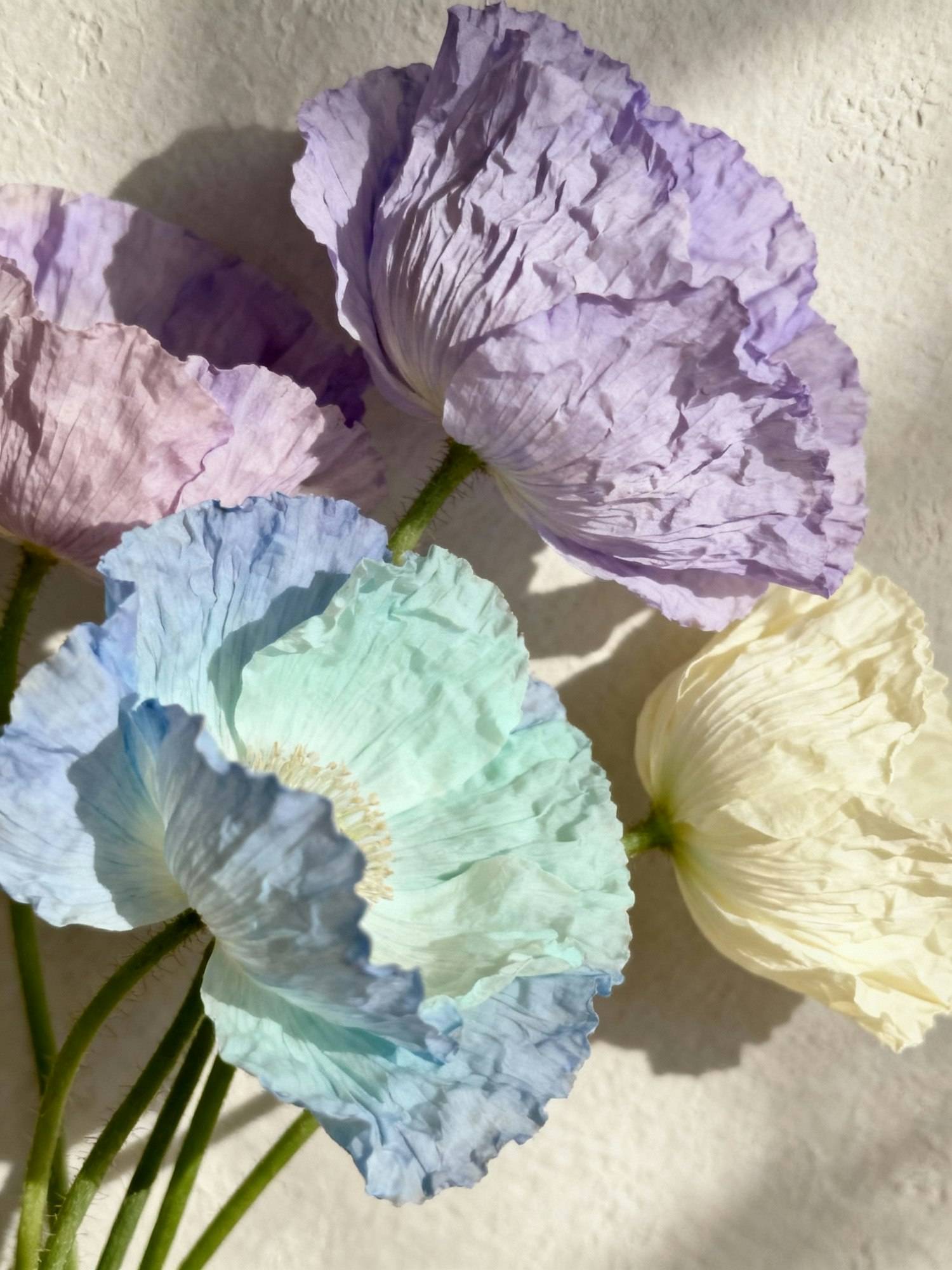 Soft retro aesthetic floral background, high quality realistic details, natural textures, vintage soft tones — Close-up of large blooming Icelandic poppies with delicate crinkled petals in pastel lavender, pale periwinkle blue, mint cream and soft lilac, arranged overlapping with visible stems, subtle natural shadows, photographed against a neutral textured background, dreamy and cool botanical atmosphere