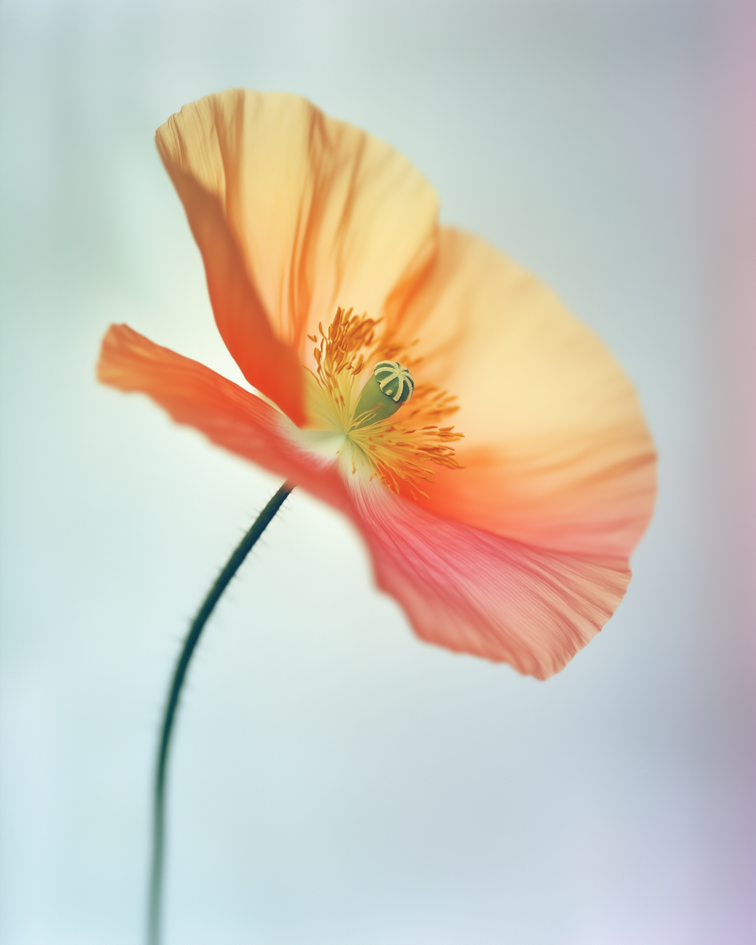 Close-up of a vibrant orange and yellow poppy flower with delicate petals and a soft pastel background.