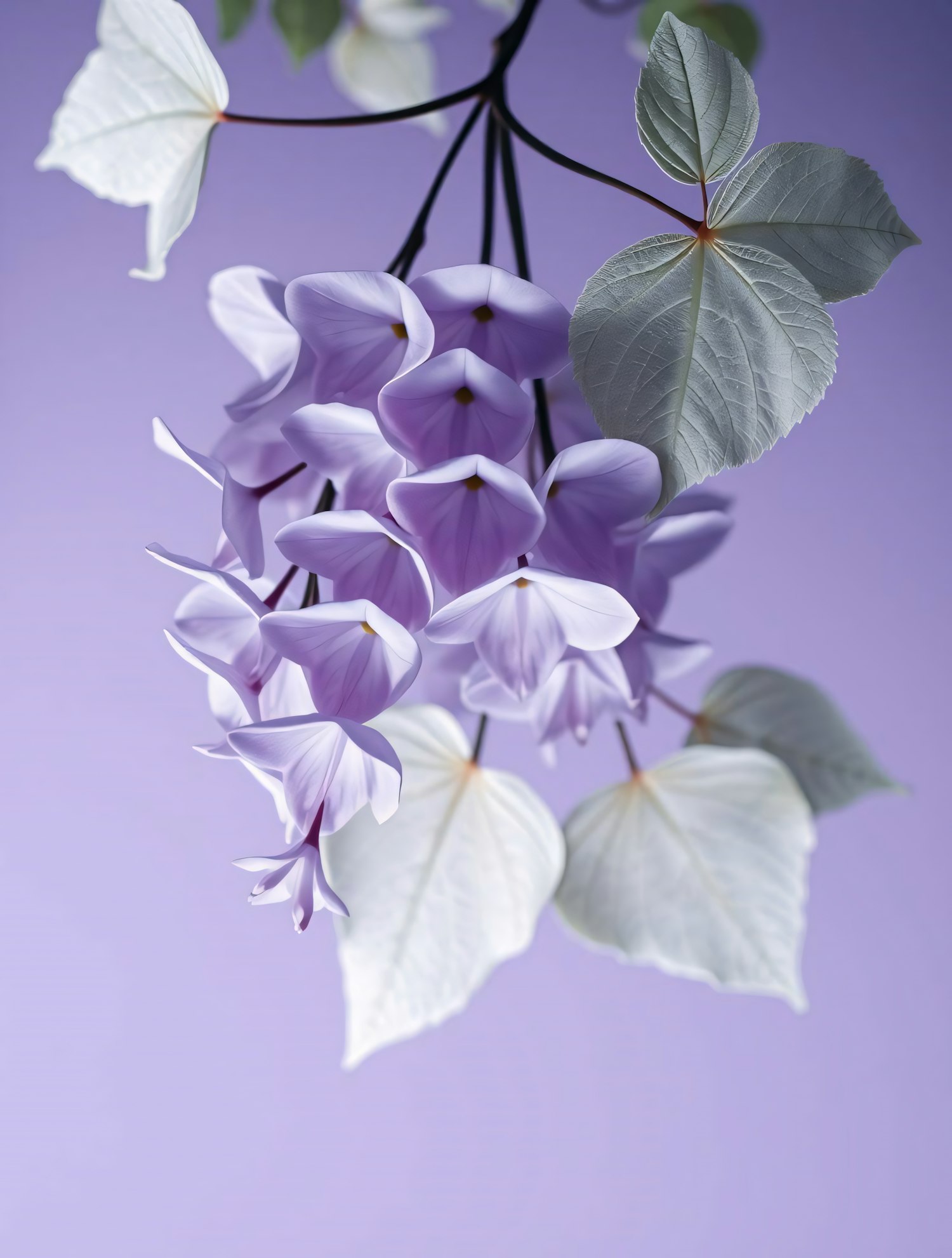 Elegant purple flowers with pale green leaves on a lavender background, showcasing nature's delicate beauty in a serene composition.