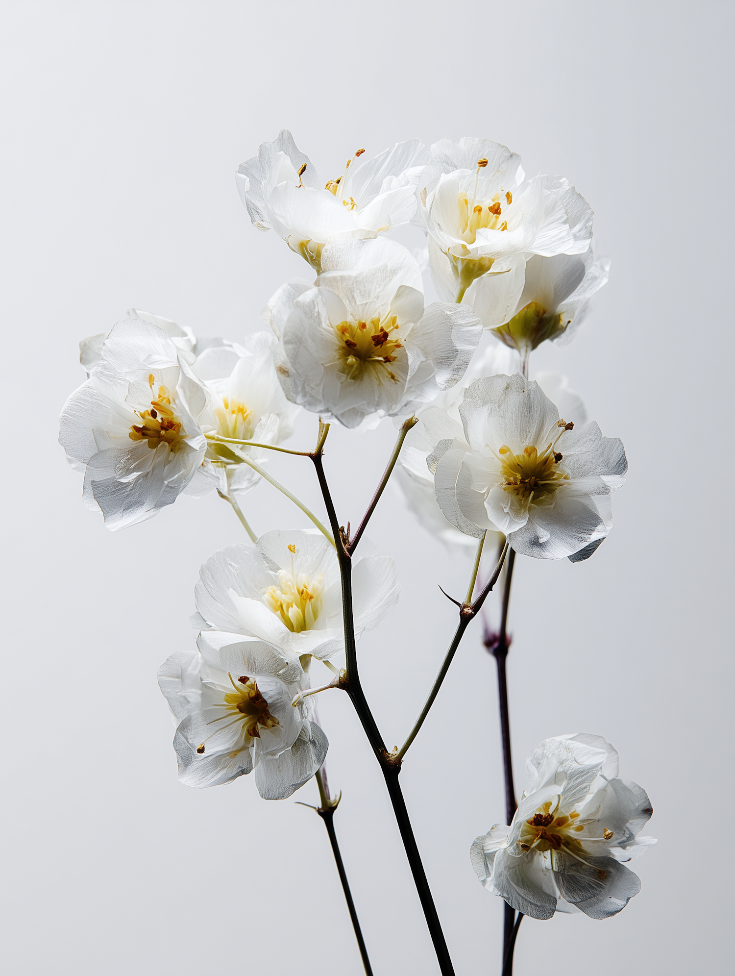 A close-up of delicate white flowers with translucent petals and yellow stamens, set against a plain light gray background.