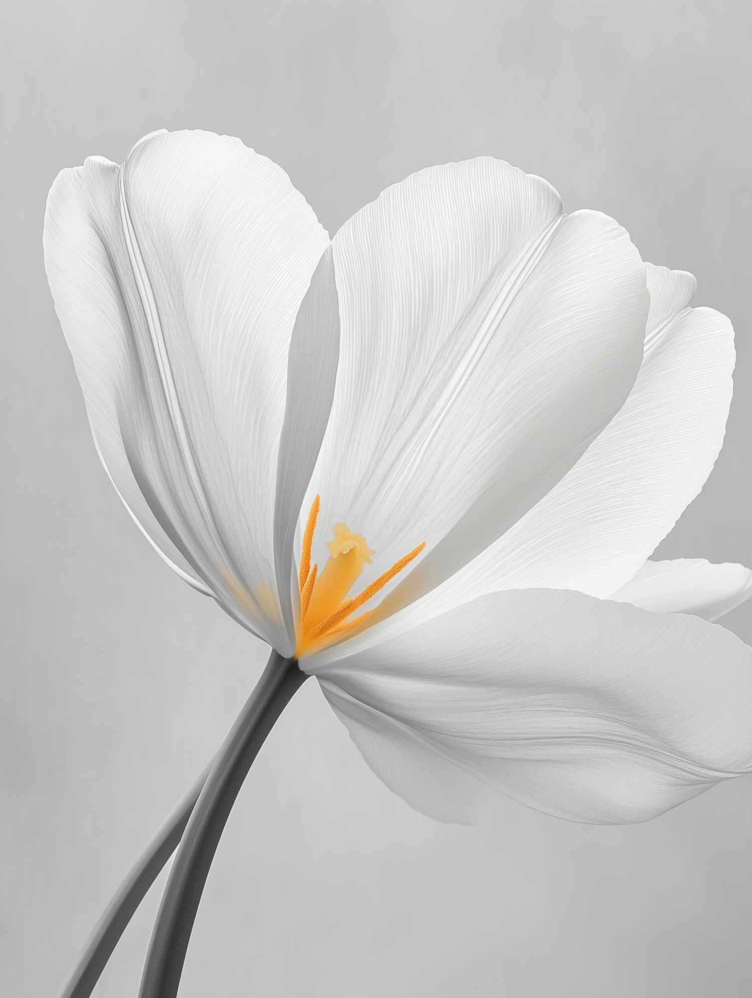 Close-up of a white flower with textured petals and vibrant yellow stamens, set against a soft gray background for a minimalist look.