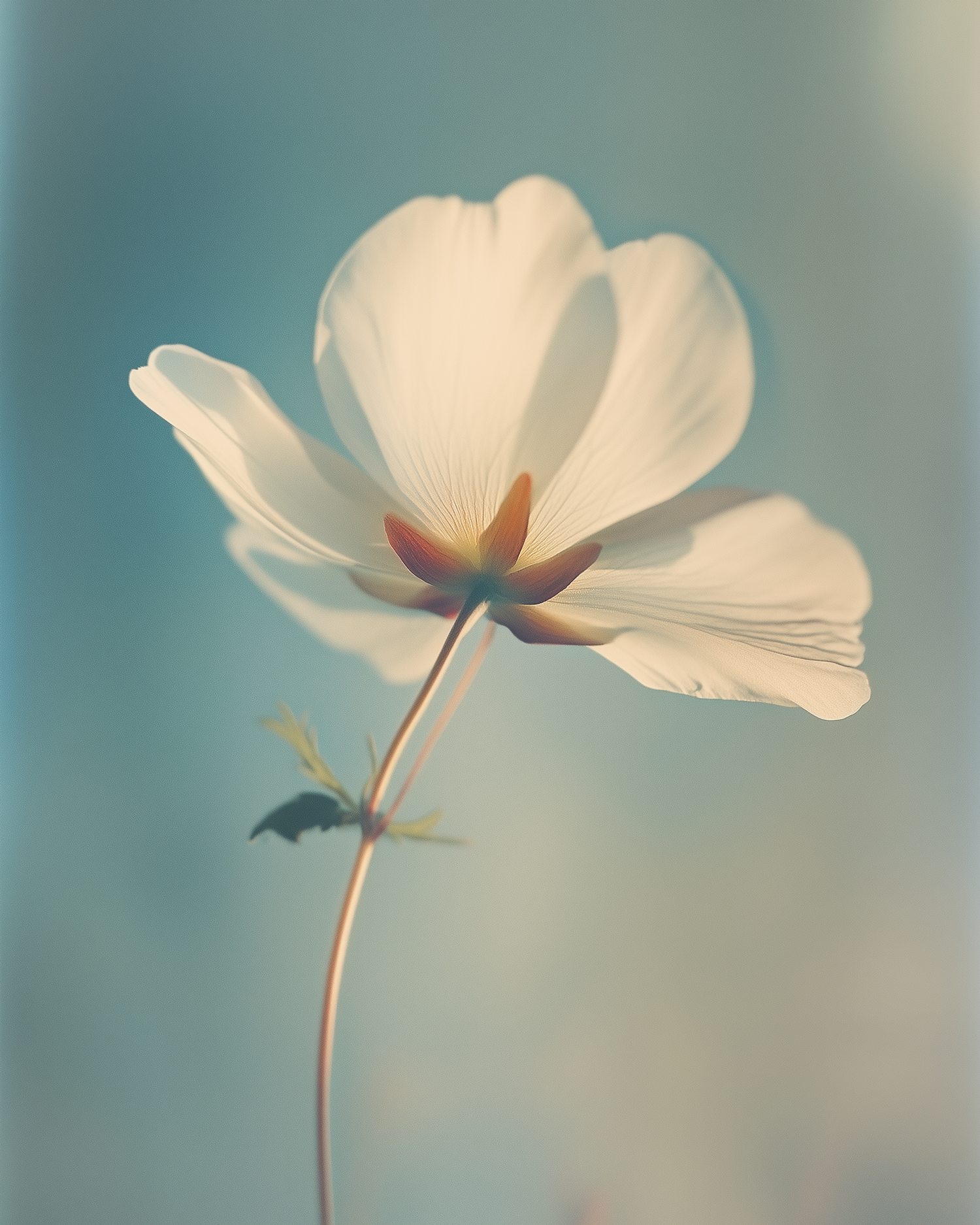 Elegant white flower with translucent petals against a soft blue background, showcasing delicate beauty and serene elegance.