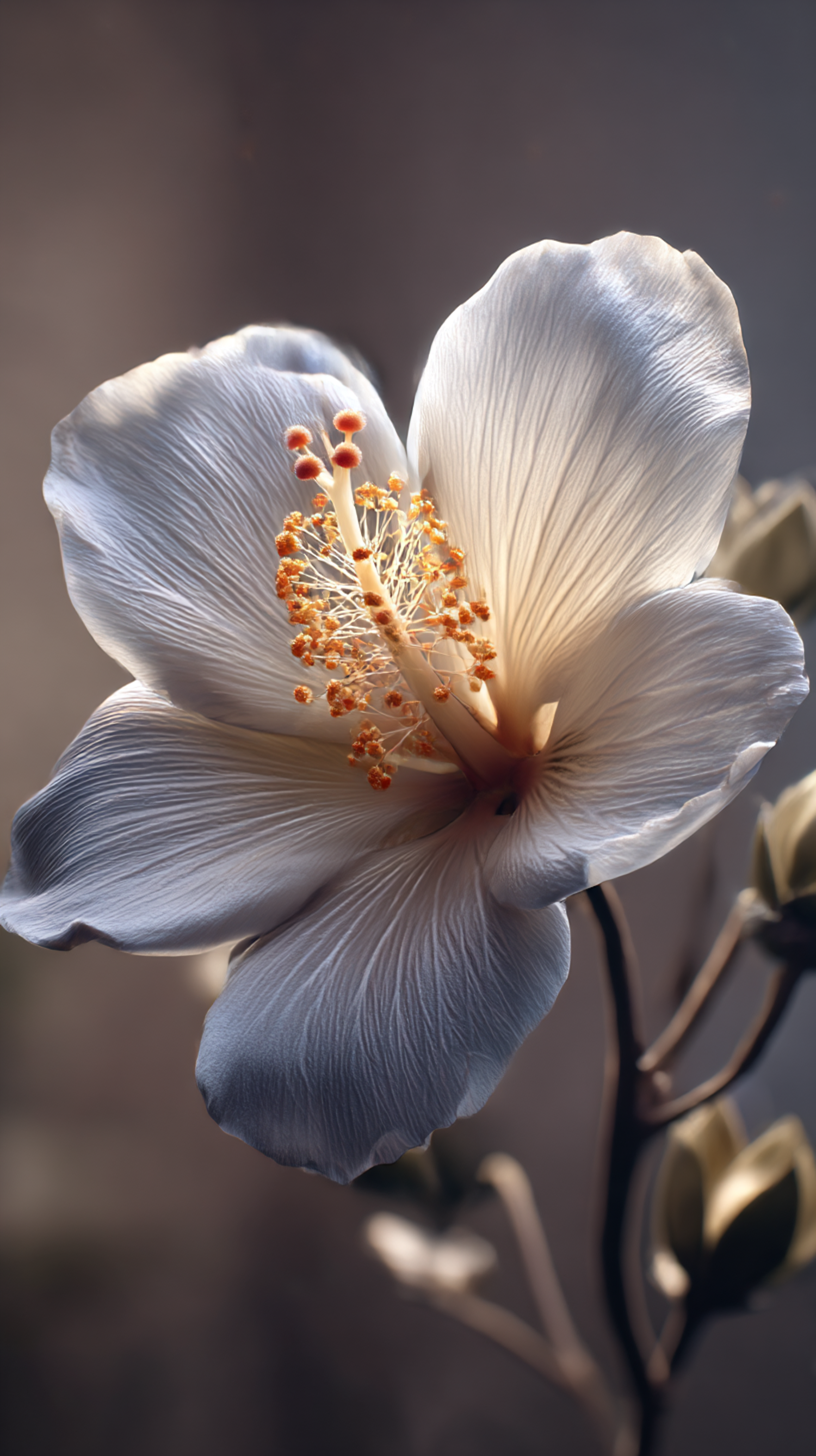 A close-up of a white flower with detailed petals and vibrant stamen, set against a softly blurred background for a serene effect.