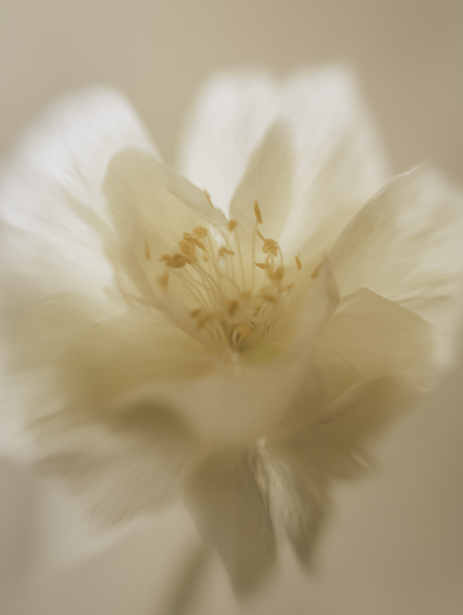Soft-focus close-up of a white flower with yellow stamens, creating a dreamy and ethereal aesthetic against a neutral background.