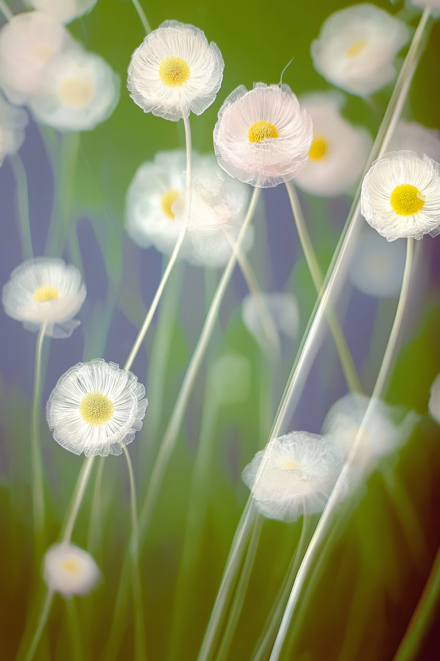 Delicate white flowers with yellow centers sway against a blurred green background, creating a serene and ethereal scene.