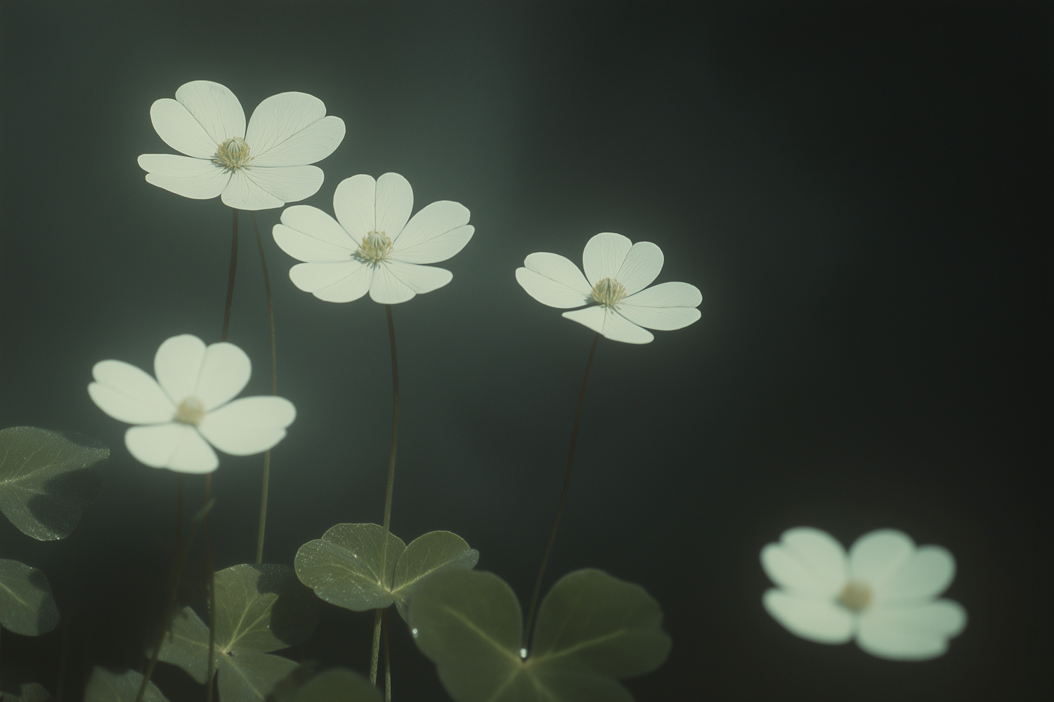 Soft white flowers with clover-like leaves against a dark green background, creating a dreamy and tranquil nature scene.