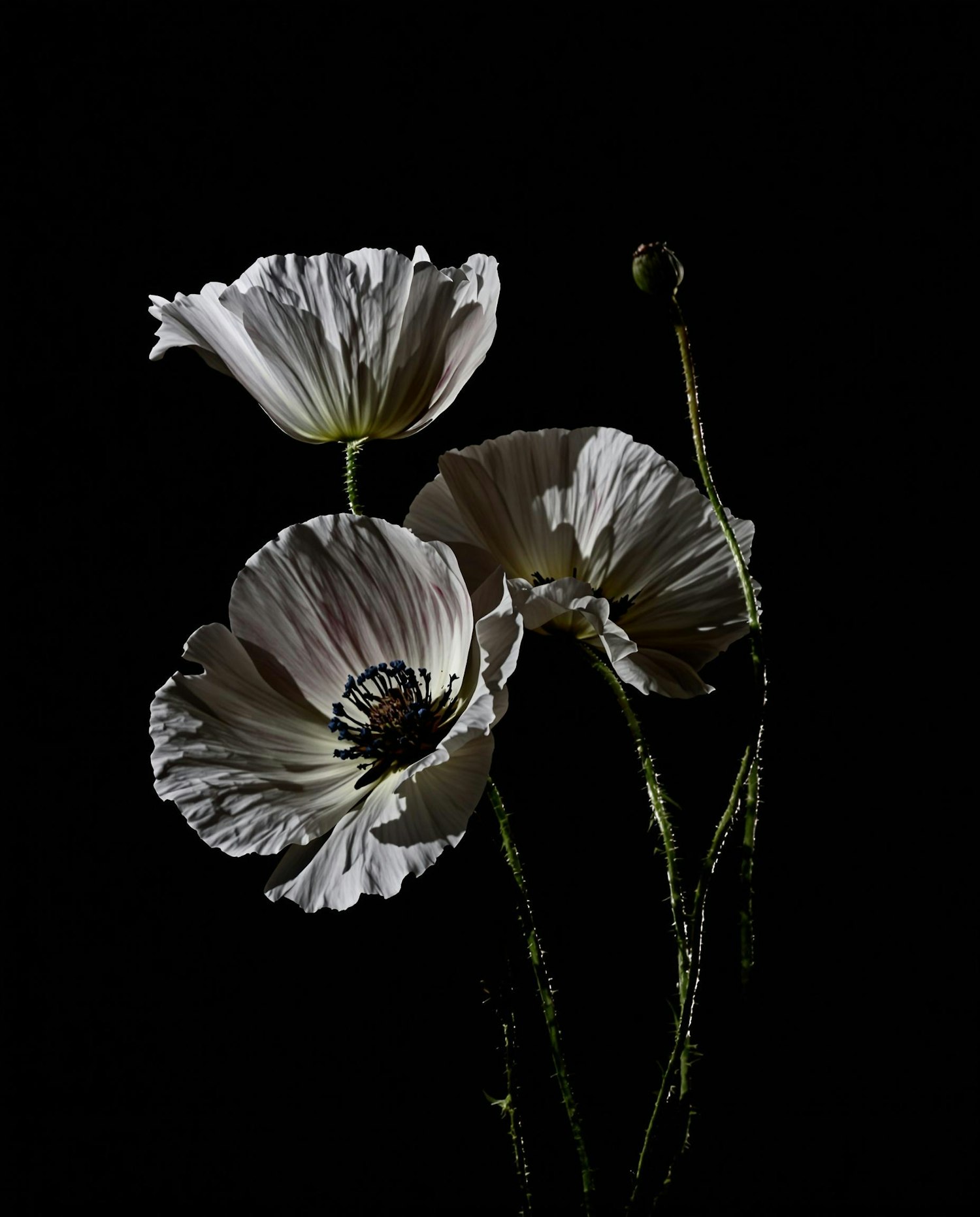 Elegant white poppies with textured petals and a dark stamen stand out against a black background, creating a striking floral composition.