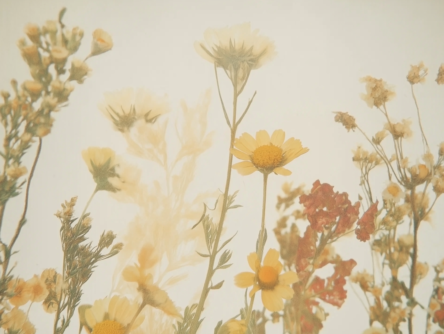 A serene arrangement of wildflowers in soft yellow and cream tones, creating an ethereal and calming atmosphere.