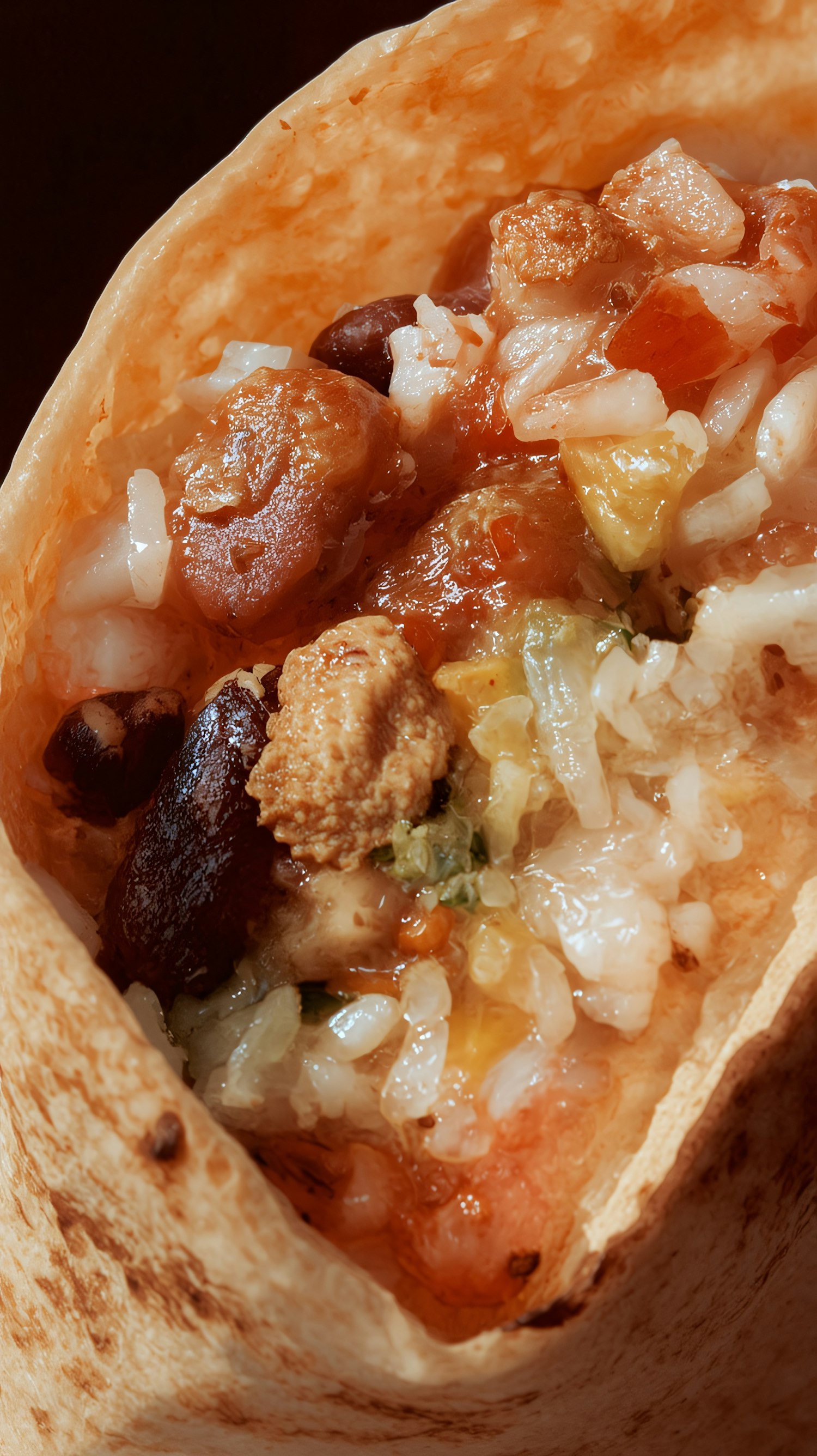 Close-up of a burrito with rice, beans, meat, and salsa in a toasted tortilla, showcasing vibrant textures and colors.