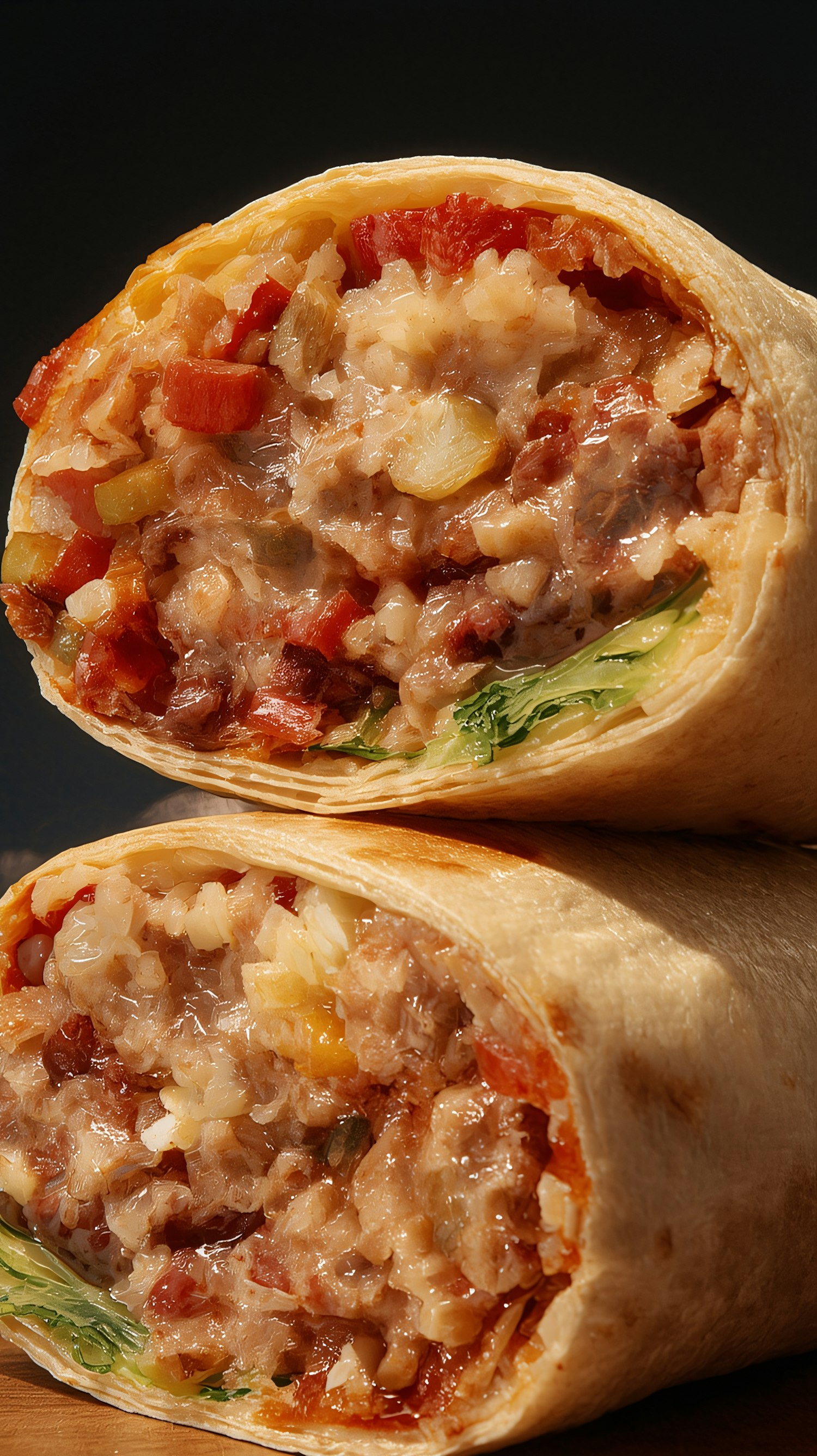 Close-up of a freshly cut burrito with vibrant fillings like rice, tomatoes, cheese, and greens, set against a dark background.