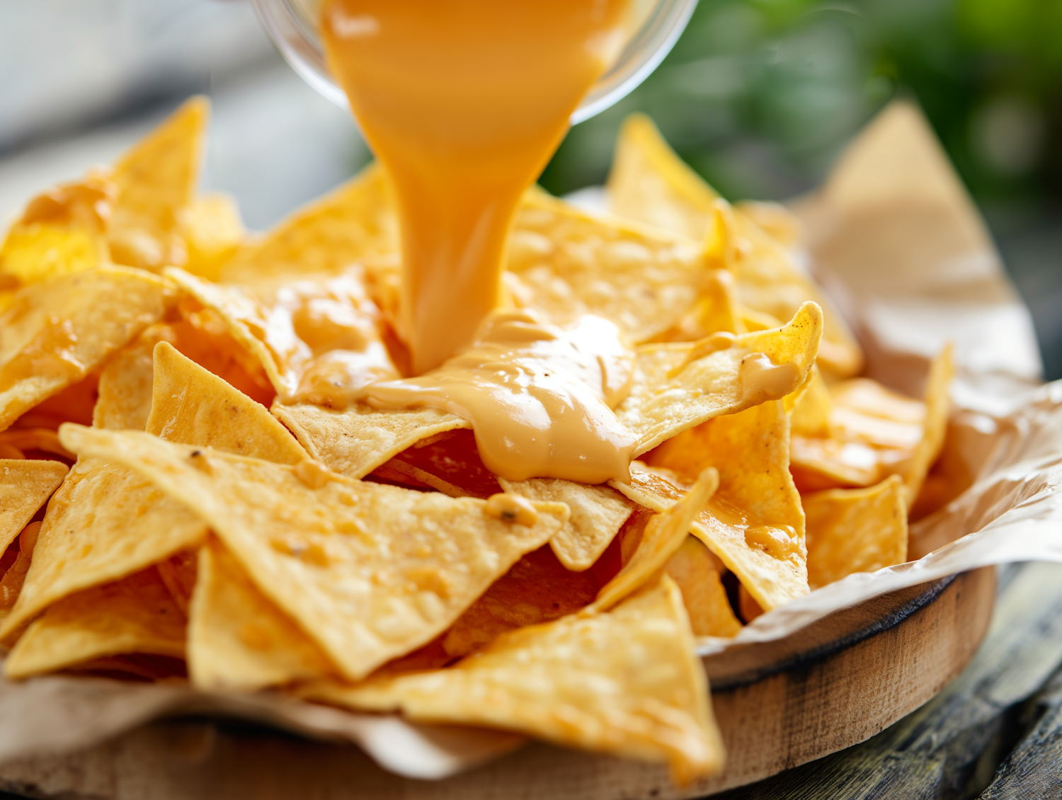 Golden tortilla chips drizzled with creamy cheese sauce, creating a mouth-watering snack scene.