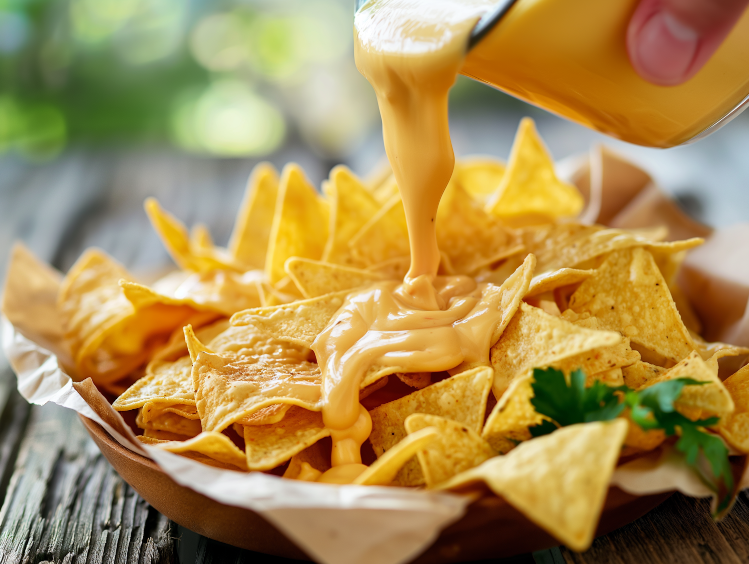 Melted cheese sauce being poured over crispy tortilla chips with cilantro garnish on a rustic wooden table.