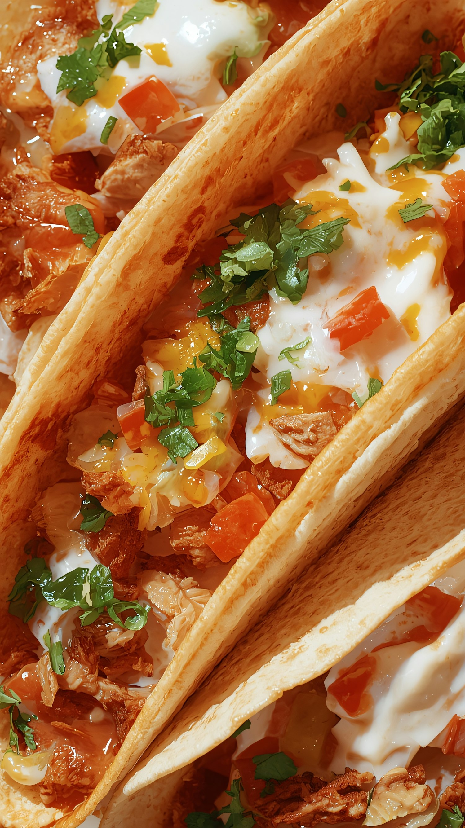 Close-up of three soft tacos filled with chicken, tomatoes, cheese, and cilantro, topped with creamy sauce and served in golden tortillas.