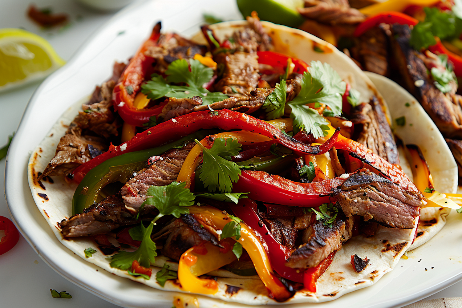 Delicious beef fajitas with colorful bell peppers and fresh cilantro on a charred tortilla, garnished with lime and salt.