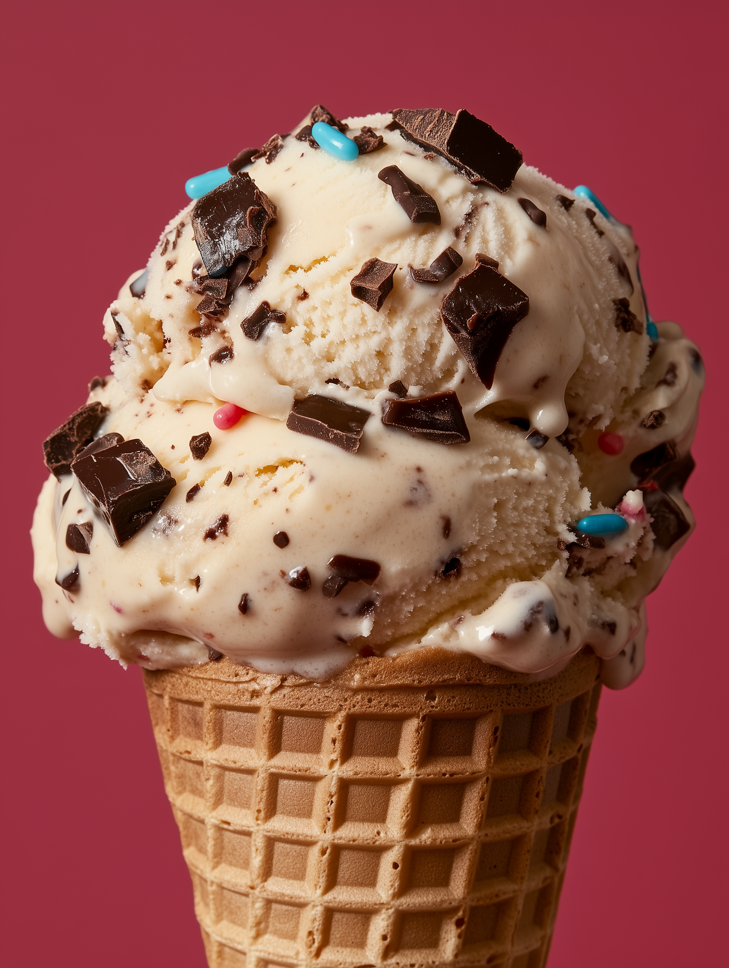 Close-up of a vanilla ice cream cone with chocolate chunks and colorful sprinkles against a vibrant pink background.