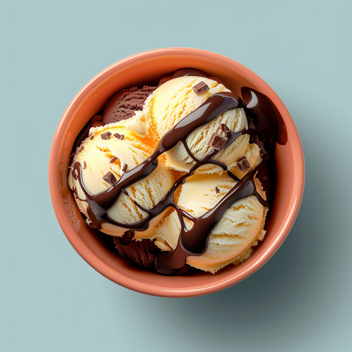 Delicious vanilla and chocolate ice cream scoops with chocolate syrup in a terracotta bowl on a teal background.