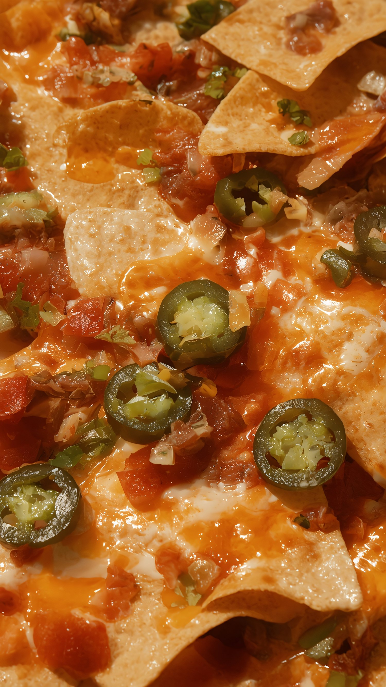 Close-up of nachos with melted cheese, diced tomatoes, jalapeños, and cilantro, showcasing vibrant colors and textures.