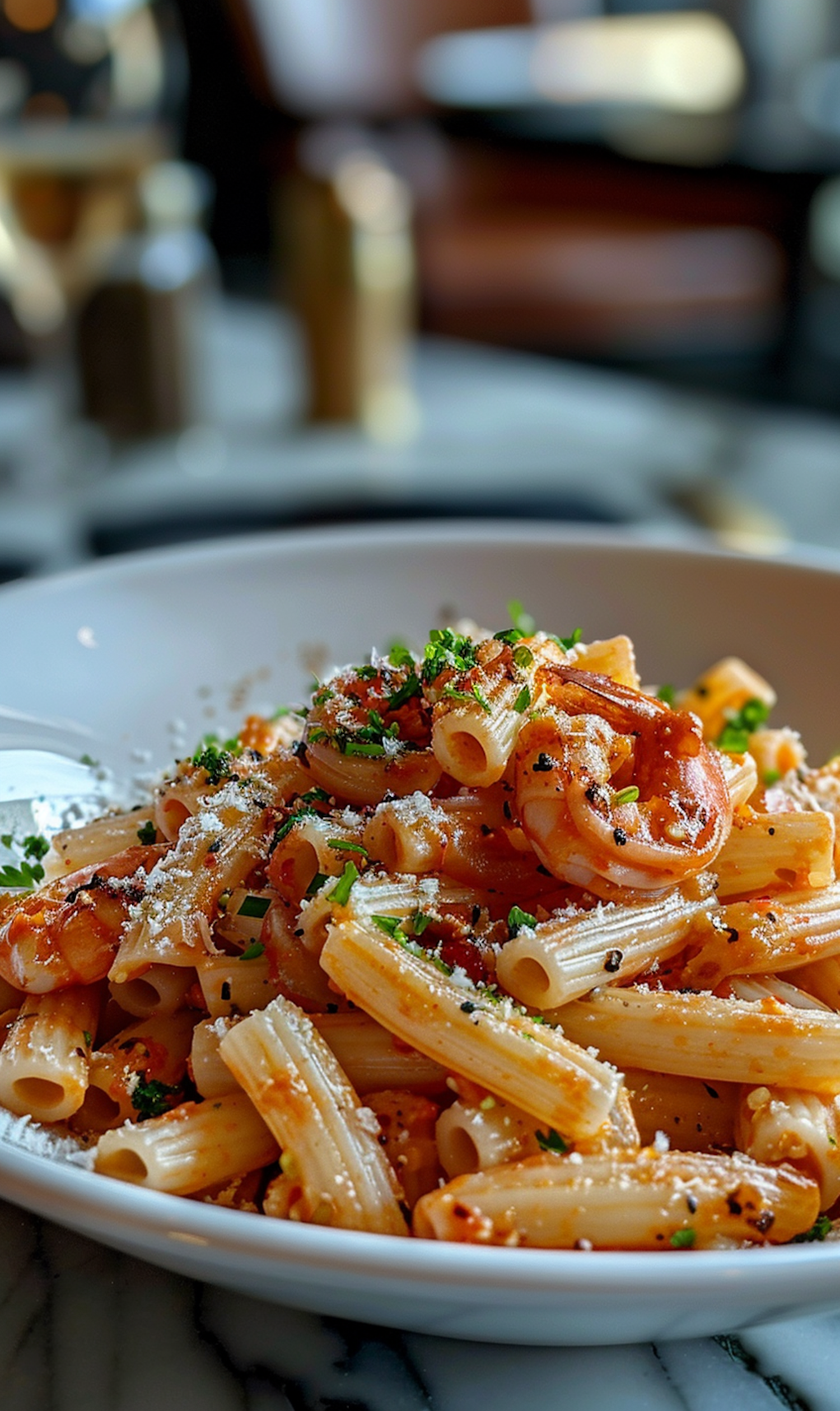 Close-up of rigatoni pasta with shrimp in tomato sauce, garnished with parsley and Parmesan, served in a white bowl.