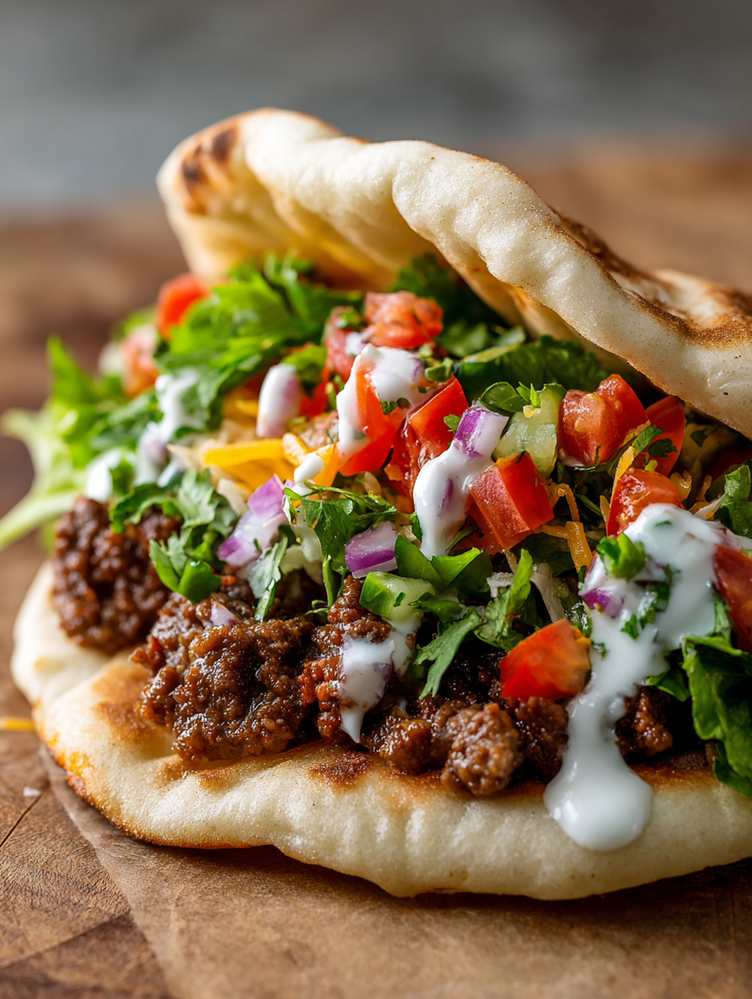 A vibrant flatbread taco with seasoned meat, fresh veggies, and creamy sauce, perfect for a flavorful and satisfying meal.