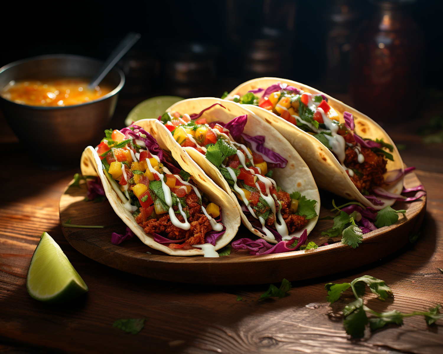 Three colorful tacos with seasoned meat, fresh veggies, and creamy sauce on a wooden platter, paired with lime and salsa.