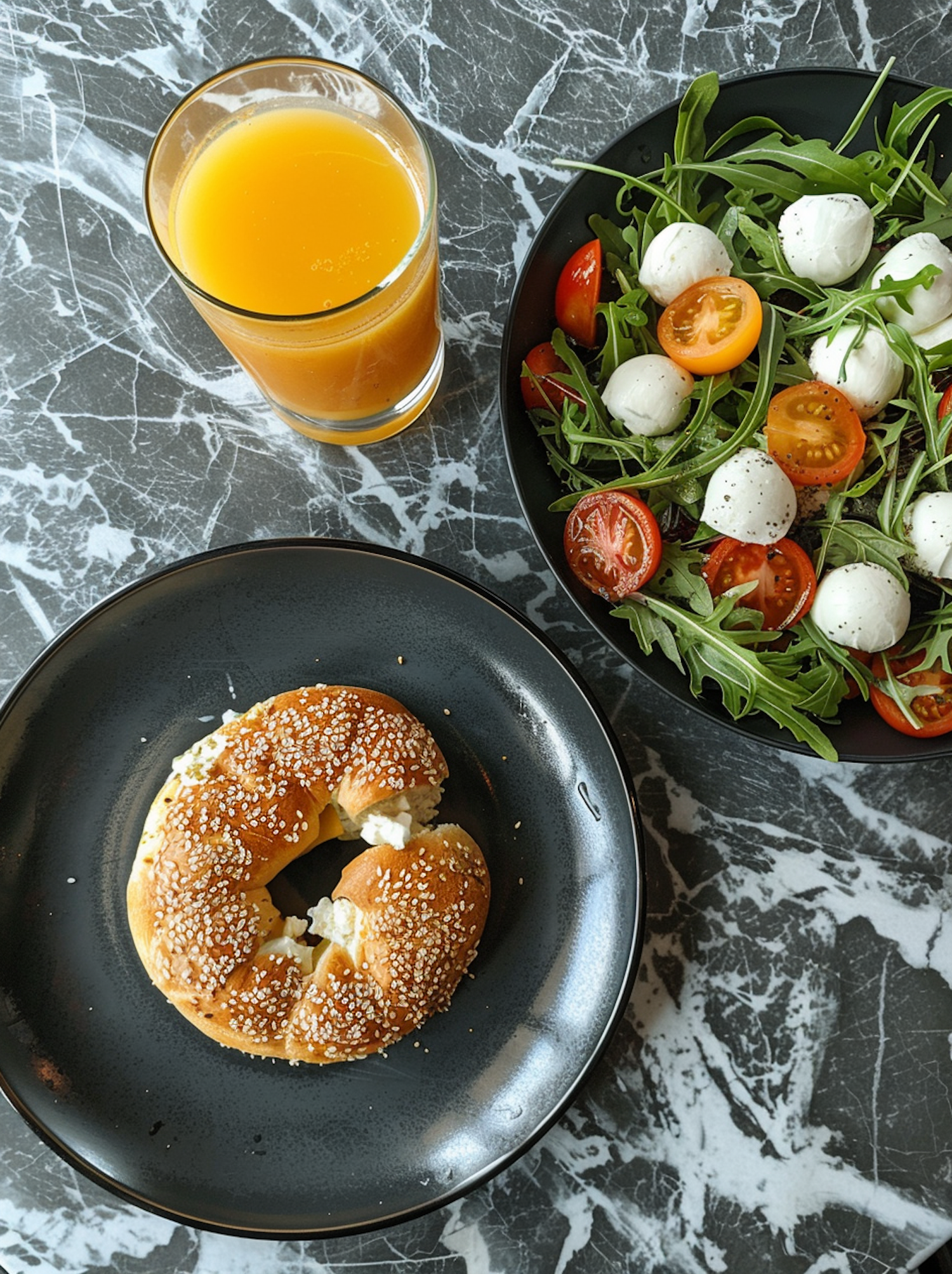 Delicious breakfast with orange juice, a fresh salad, and a sesame bagel with cream cheese on a marble table.