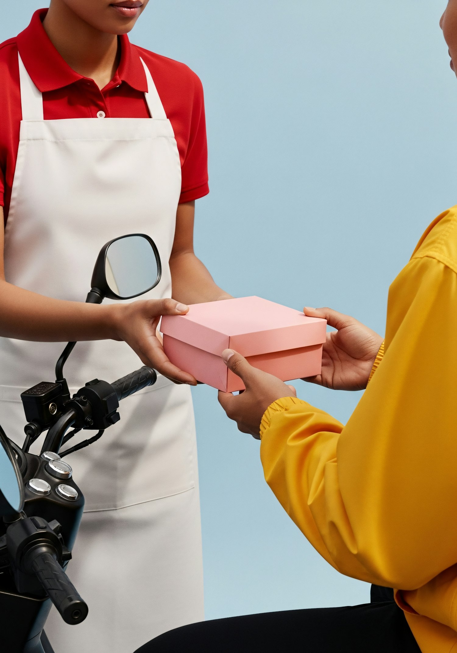 A delivery person hands a pink box to a recipient, set against a light blue background with a motorcycle handlebar visible.