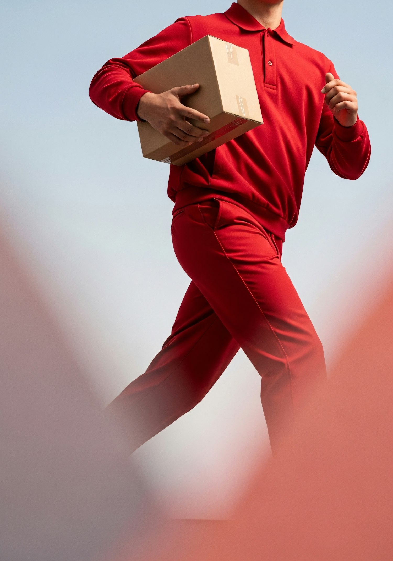 A person in a red uniform carrying a box, captured mid-stride with a blurred background, emphasizing motion and vibrant colors.